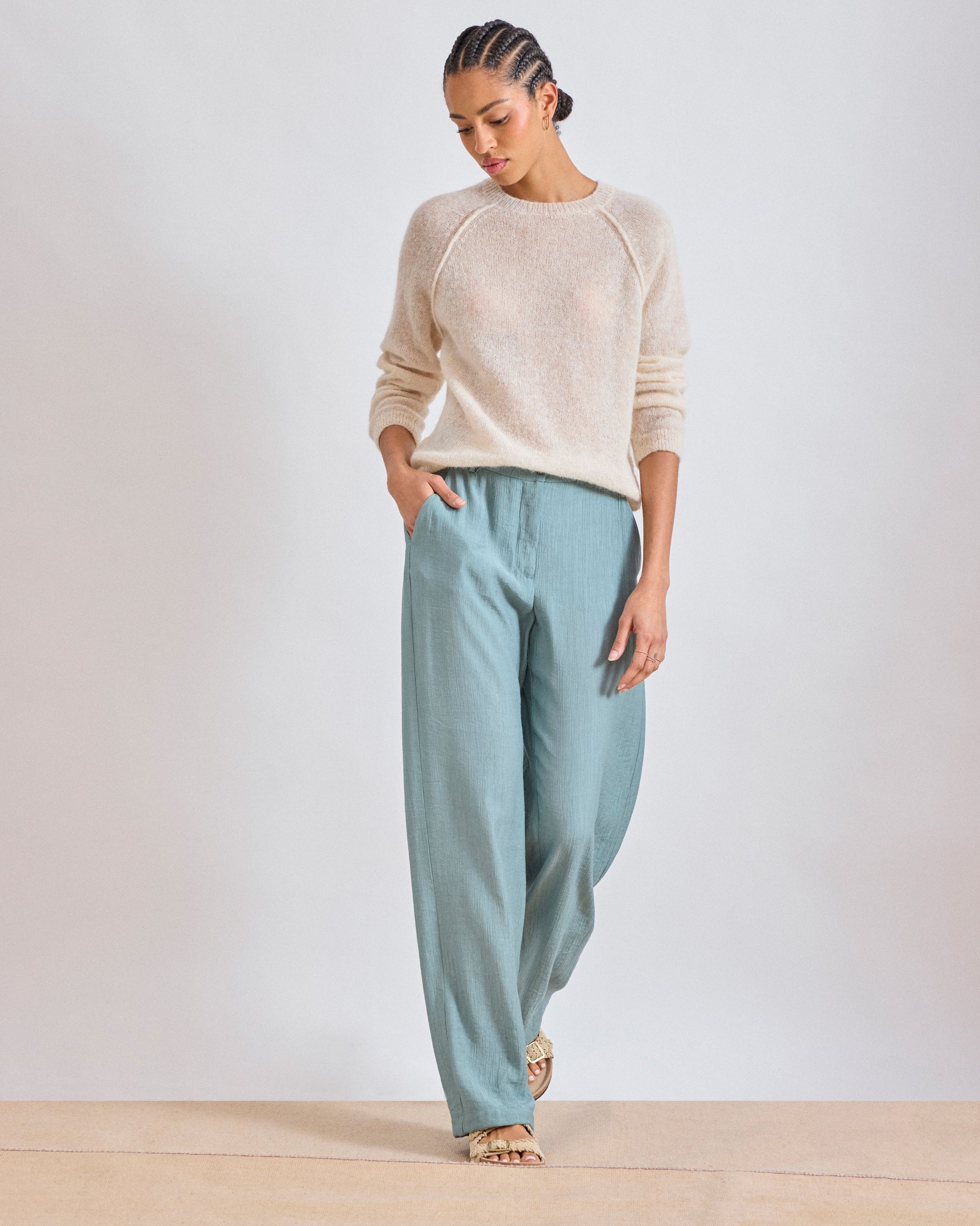 Wide, flowing women's pants in crinkled, plain viscose. High waist, flat waistband with belt loops and zipper. Two side pockets.