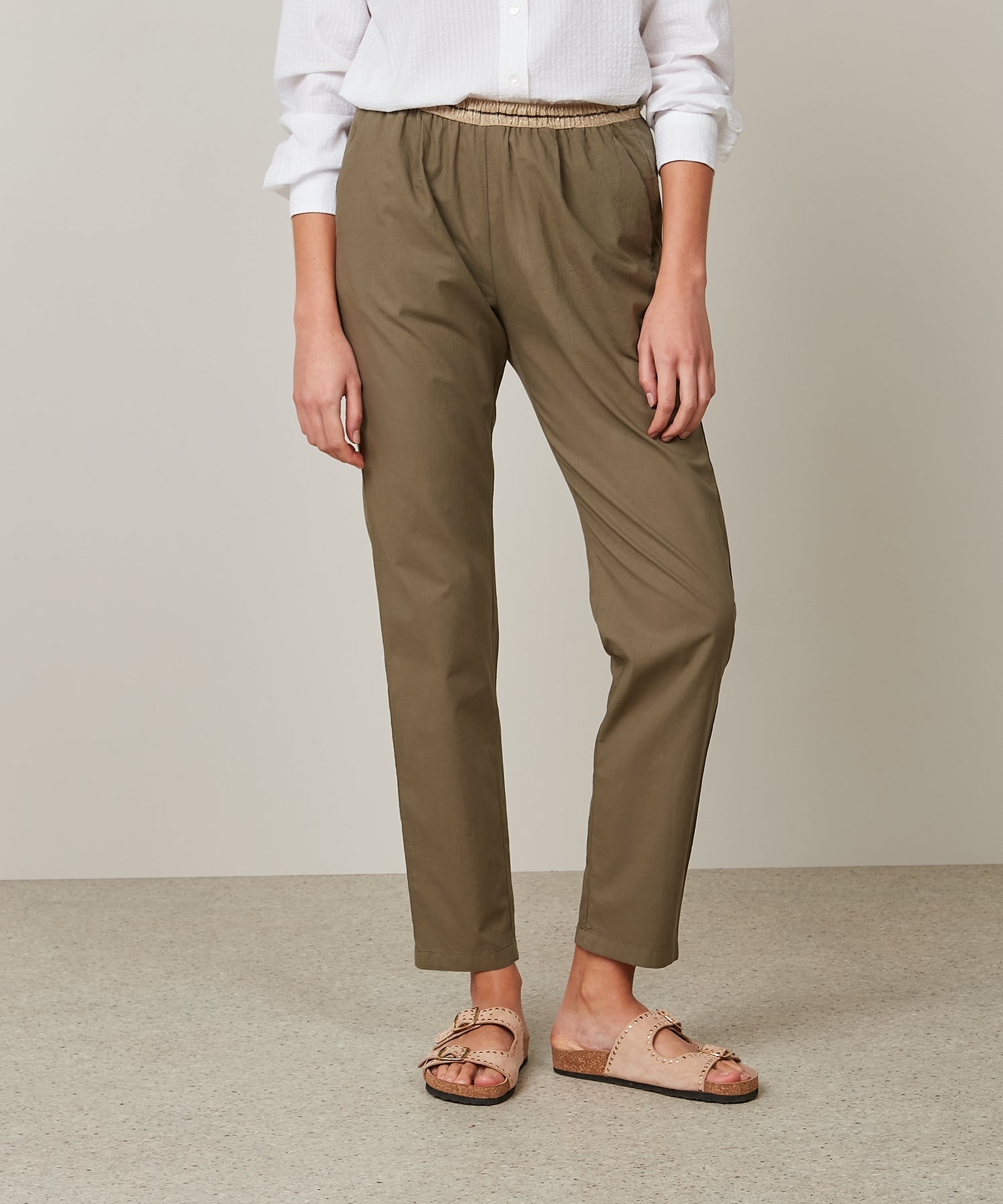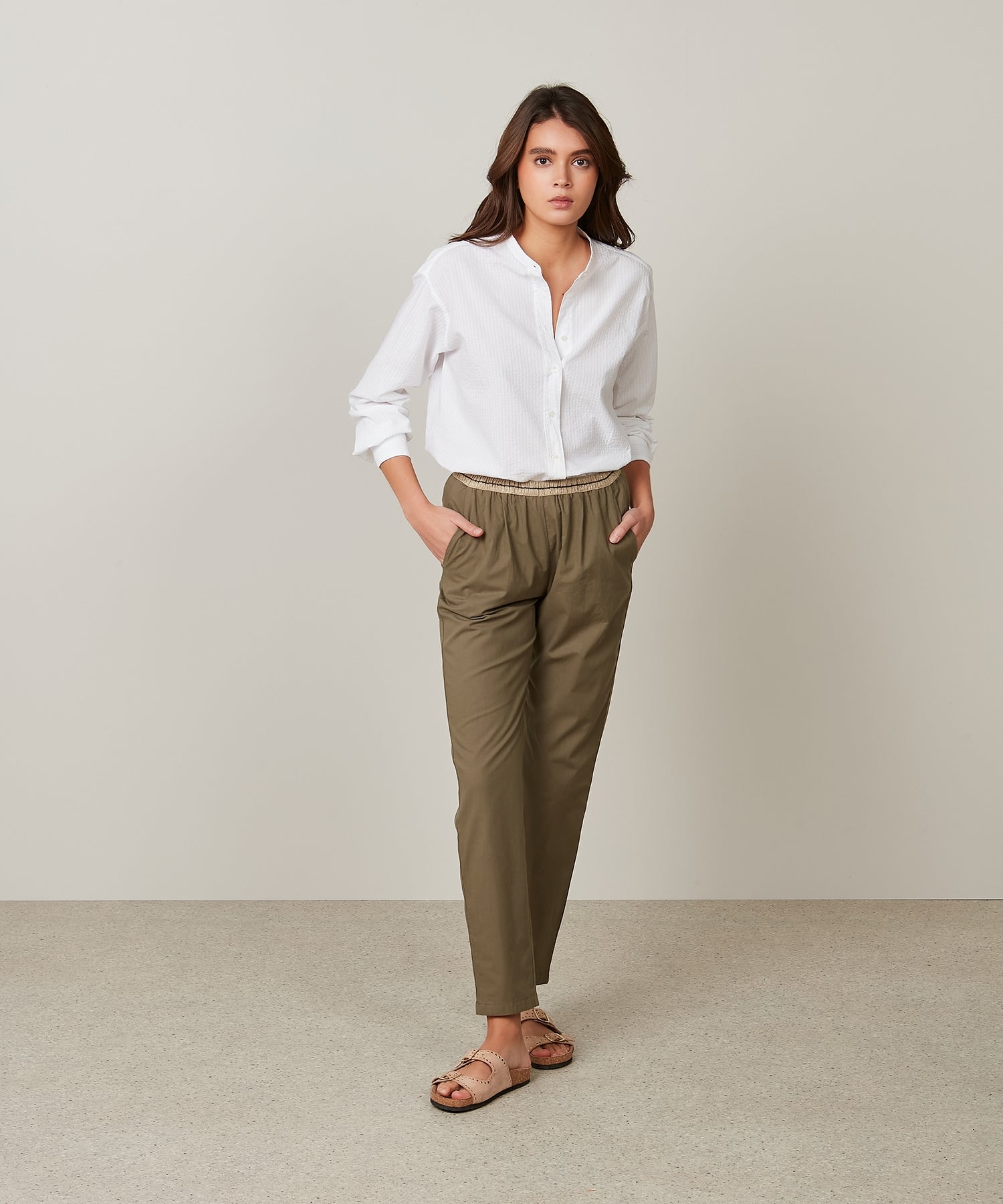 This Hartford Pove Straight-cut Elastic Waist Cotton Pants are precisely tailored with relaxed proportions and are crafted from cotton with a high rise waist, straight-cut legs, and are elevated with glamorous shimmery waistband. Match them with loafers for an edgy look. Model is 177cm tall and wears size 0-XS.