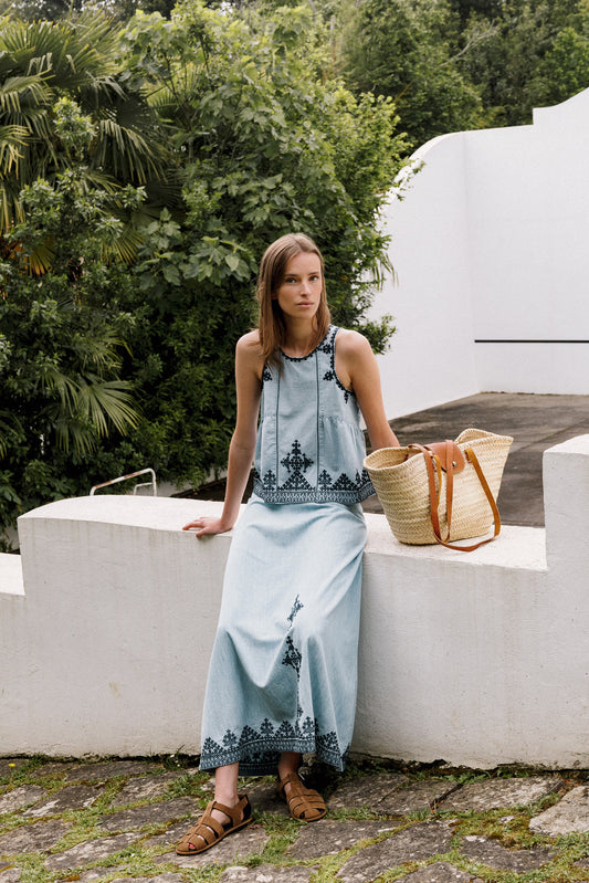 Washed denim blouse with contrasting ethnic embroidered details, a halter neck and back teardrop and button closure. Square cut and slightly short, perfect for the beginning of the season.
