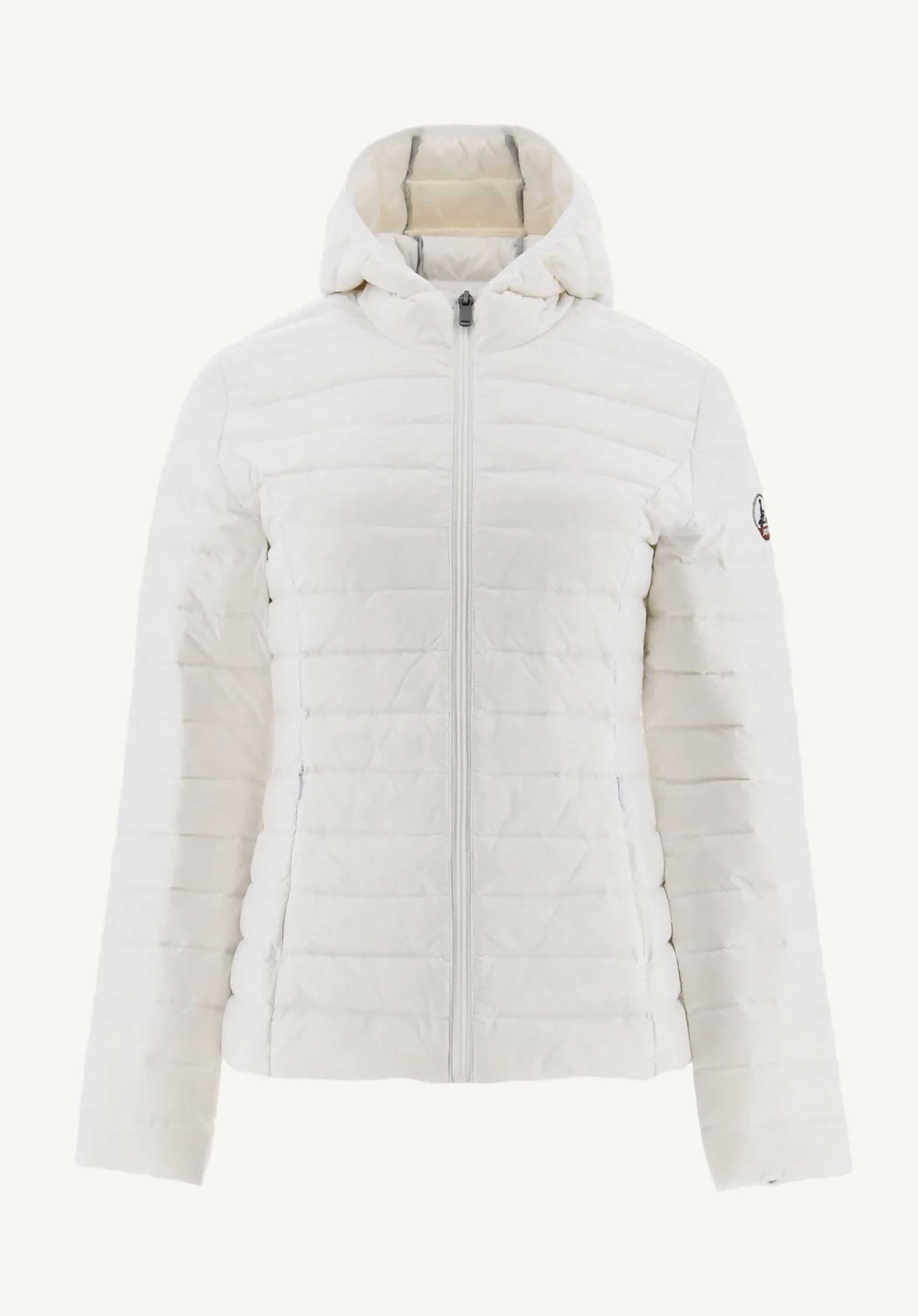 The CLOE down jacket, an iconic hooded model. You'll love its fitted feminine line, its invisible zipped side pockets, its water-repellent fabric and its light but very warm feather and down padding.