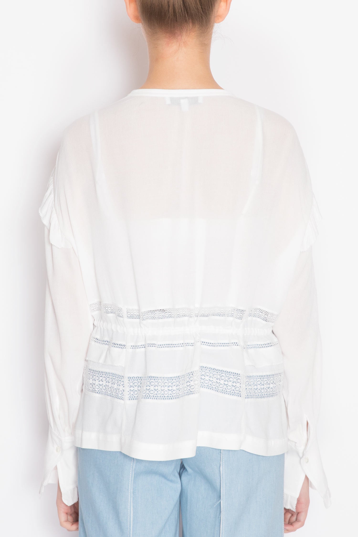 The Iro Keola Laced Long-sleeve Blouse preps up with rows of inset lace and ruffles decked along the bodice and sleeves, accompanied with an adjustable string that offers a snug fit that elegantly reveals the narrow of the waist. Round neck with front button closure.