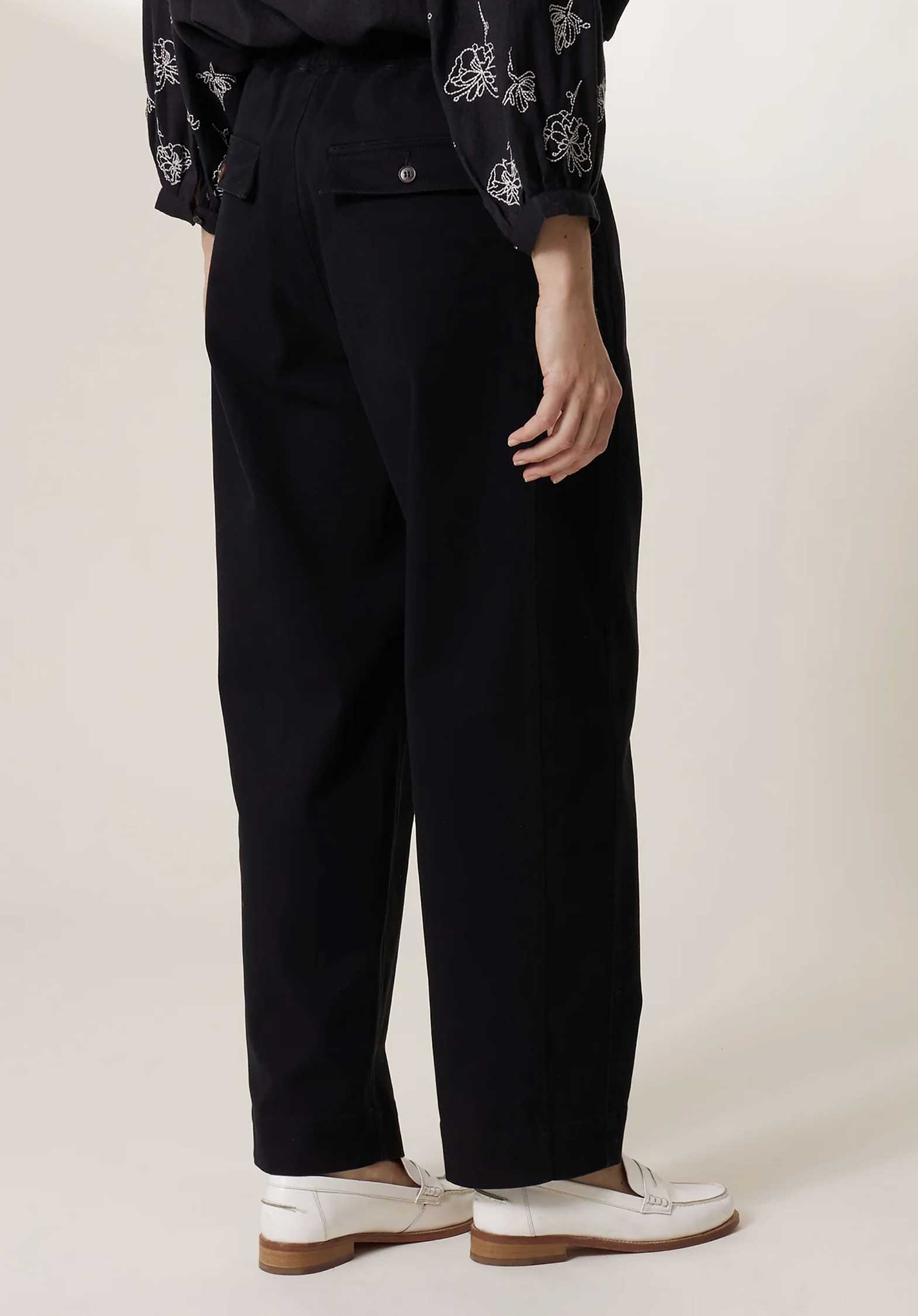The Penelope Plain trousers are a wardrobe essential with their fluid drape and straight cut. The front darts shape the silhouette while maintaining the casual spirit of the piece. The side pockets and buttoned back pockets combine practicality and style, while the hem cuff emphasizes a precise finish