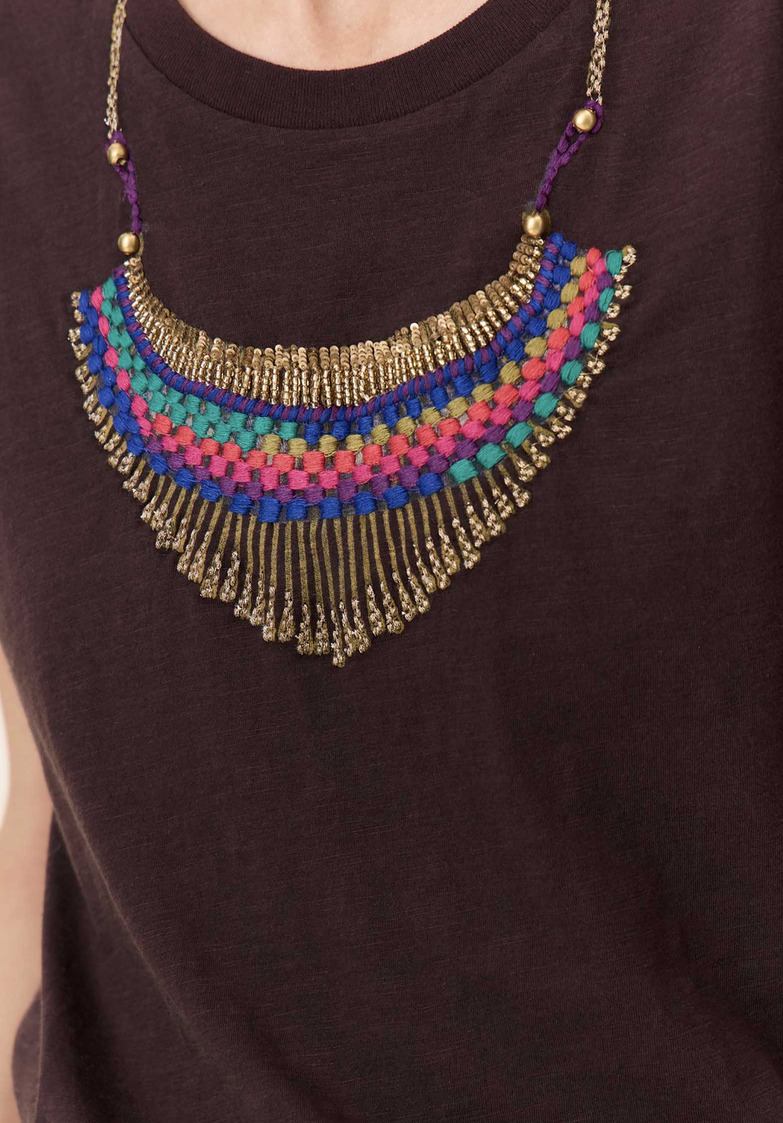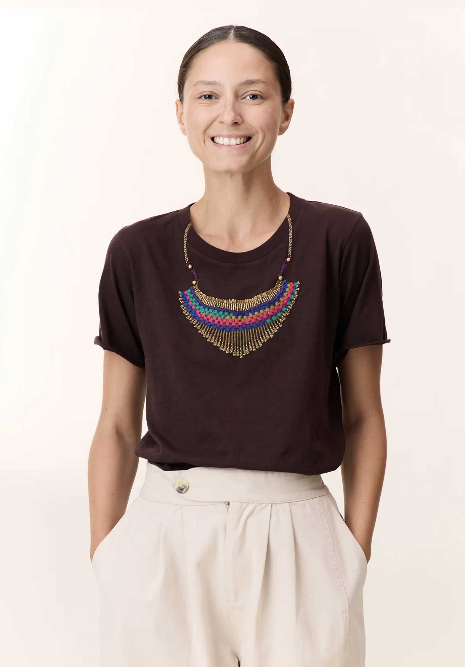 The Toro Collier t-shirt establishes itself as a revisited essential. Made from 100% organic cotton, it relies on a soft knit with natural drape, designed for everyday freedom. The round neckline reveals an appliqu motif that recalls a necklace, highlighted by textured details and a clean finish