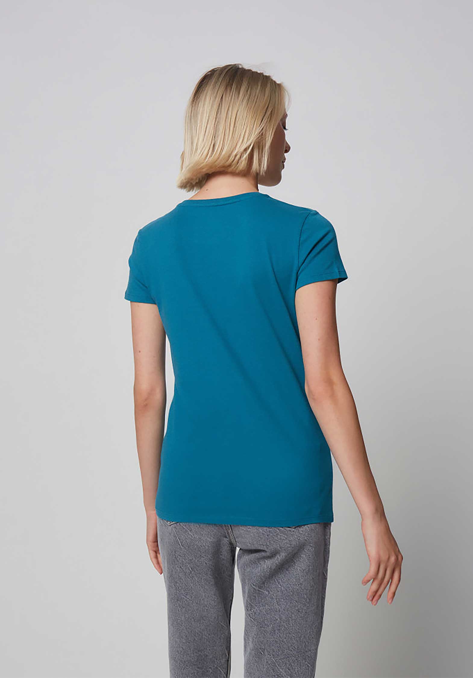 The Jamie t-shirt has a round neck with ribbed finishings. Short sleeved with a straight cut.