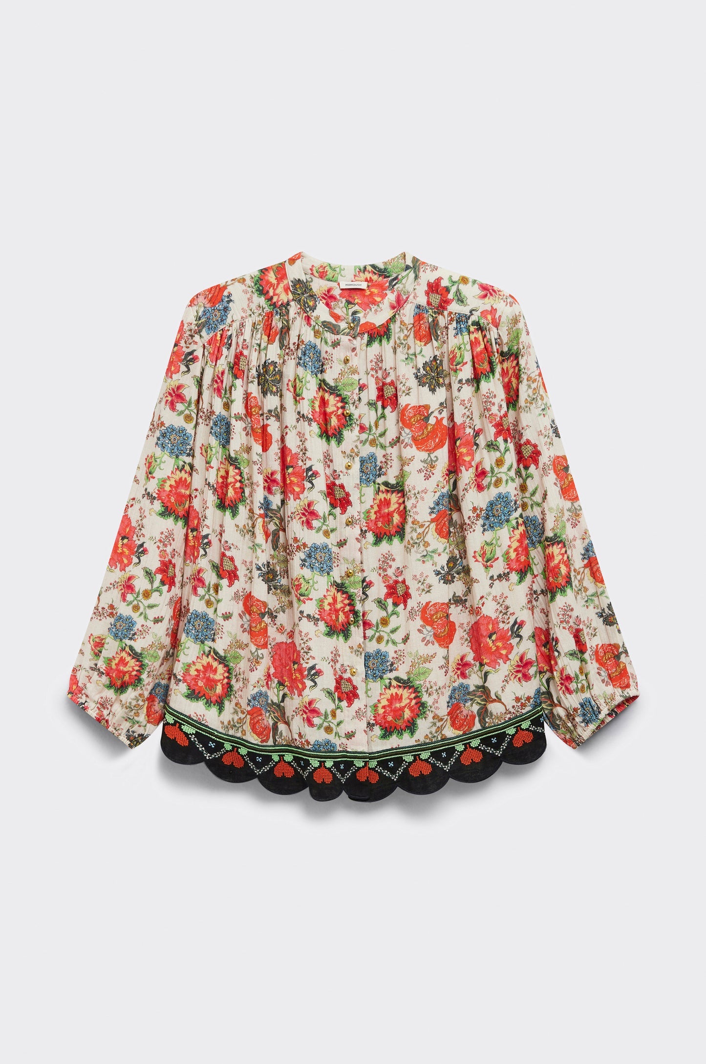 This flared shirt features a delicate floral print, finished with woven hearts, adding a feminine and romantic touch to its light and flowing cut.