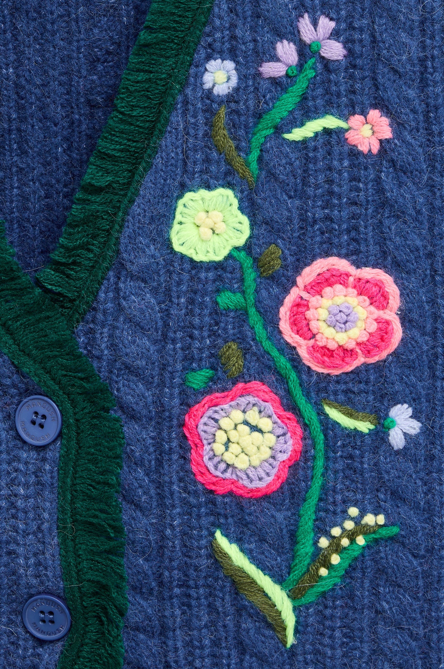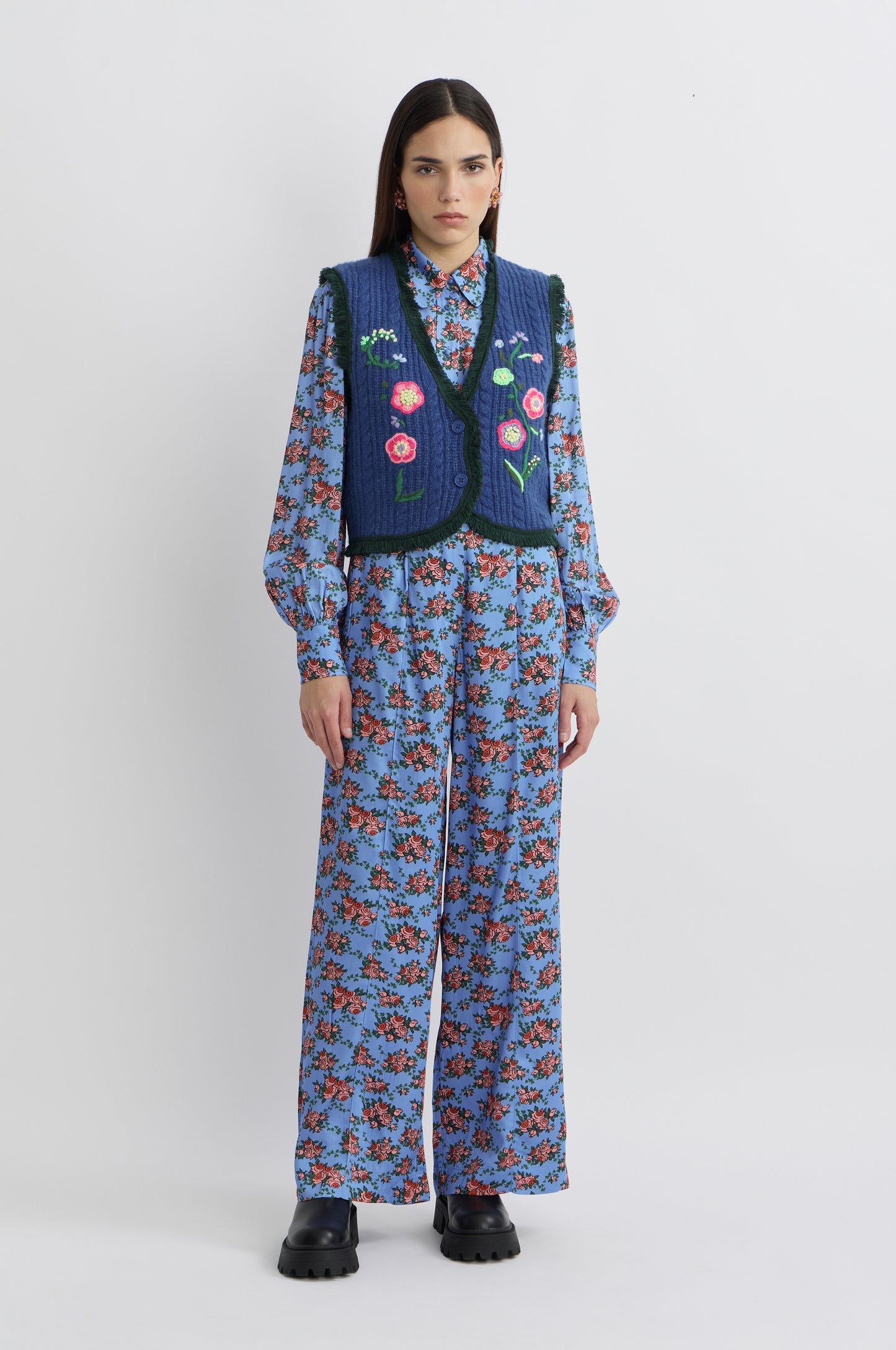 This cable-knit vest stands out with its delicate floral embroidery and fringed finishes, blending bohemian charm with artisanal elegance for a look that is both warm and romantic.