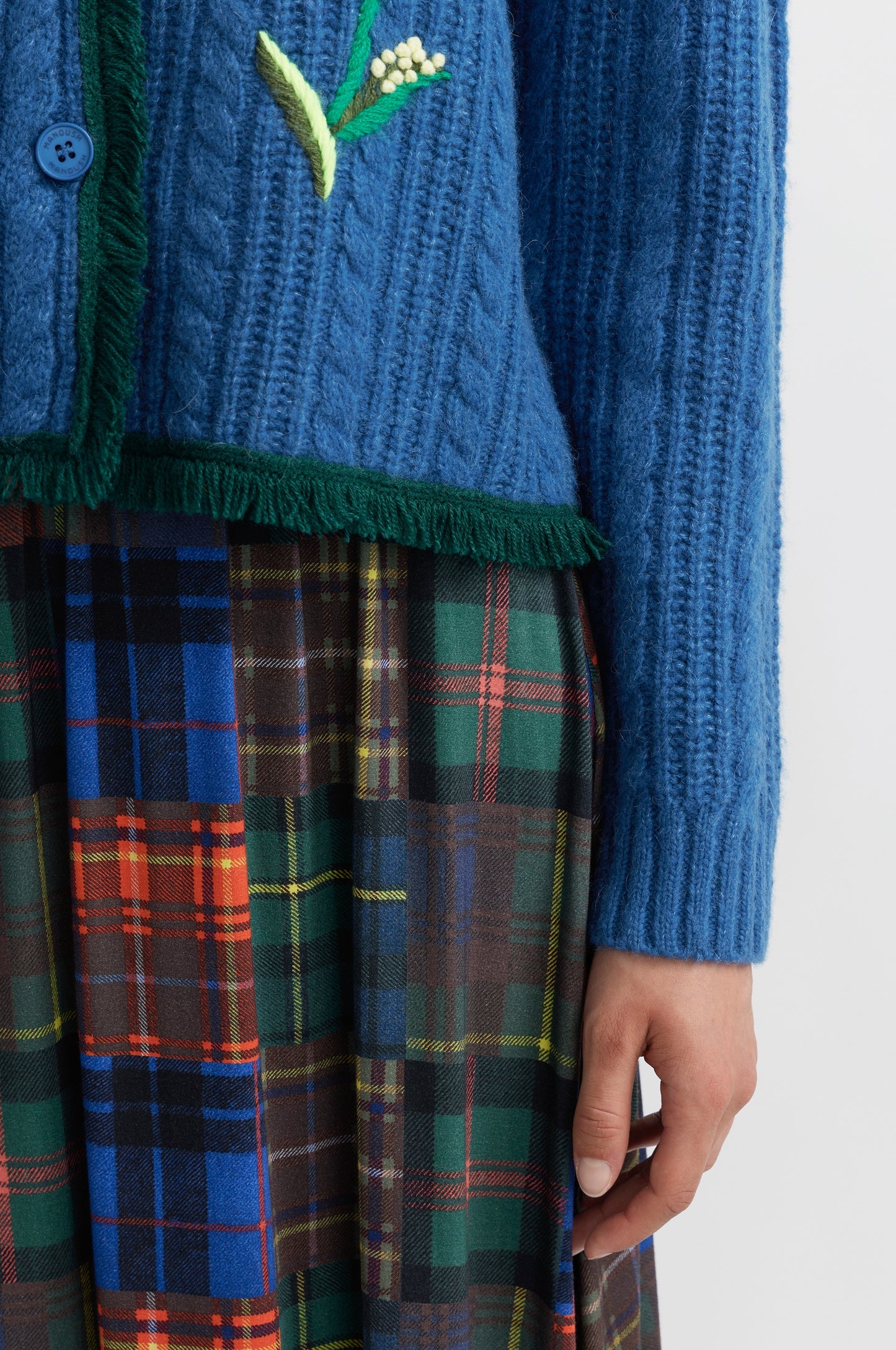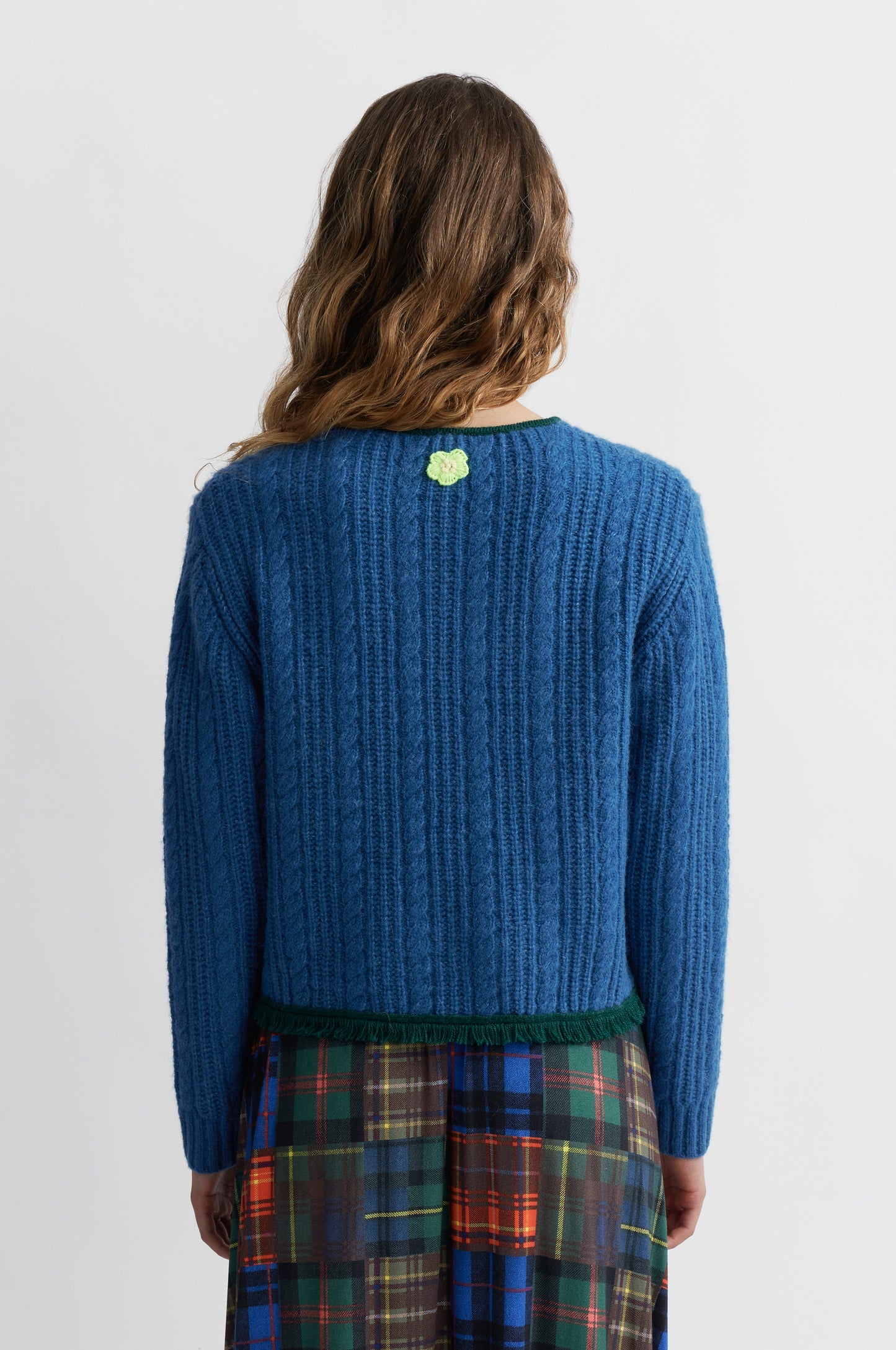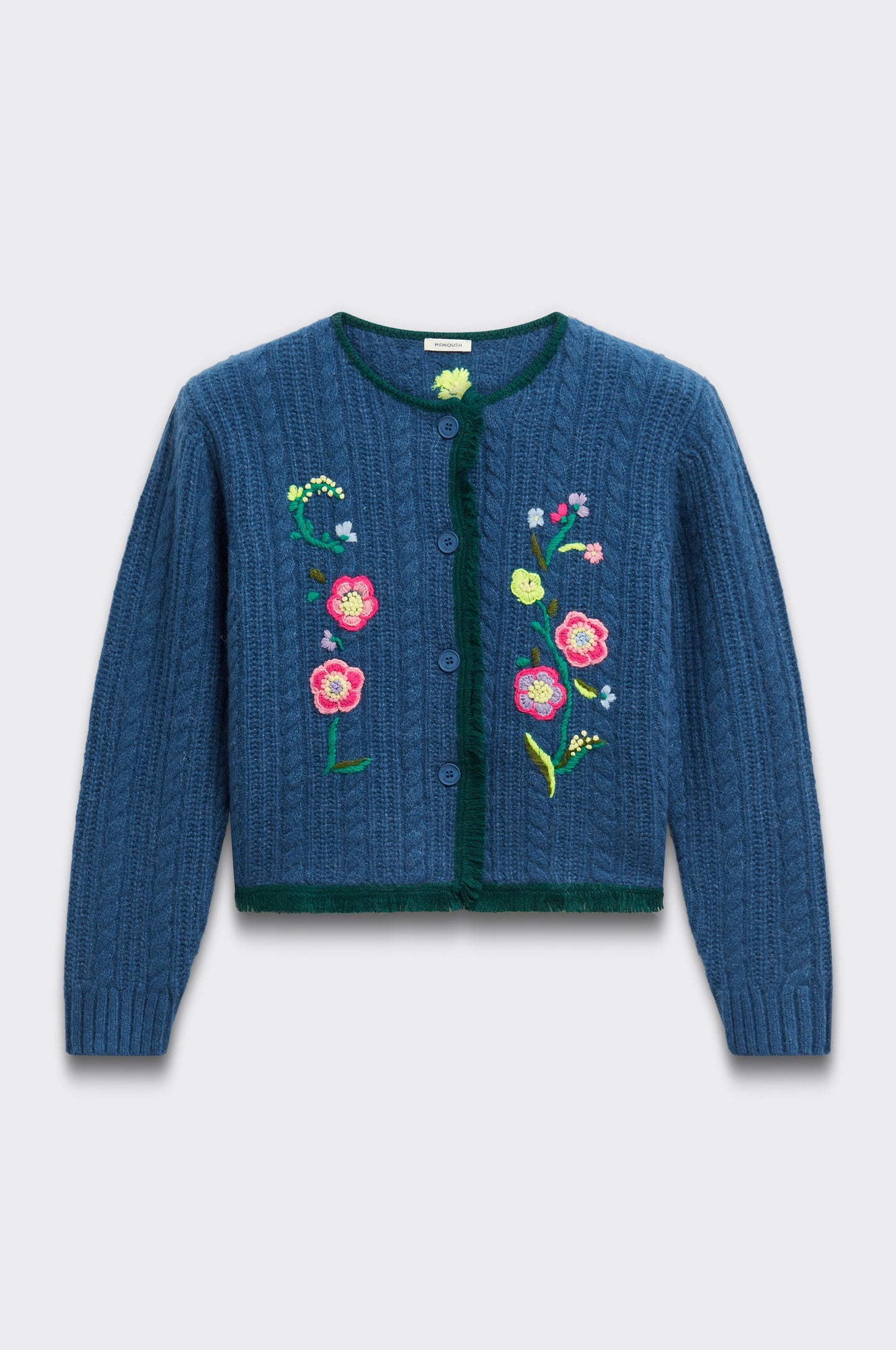 This cable-knit cardigan is enhanced with delicate floral embroidery and fringed details, adding a bohemian and feminine touch to its cozy and refined cut.
