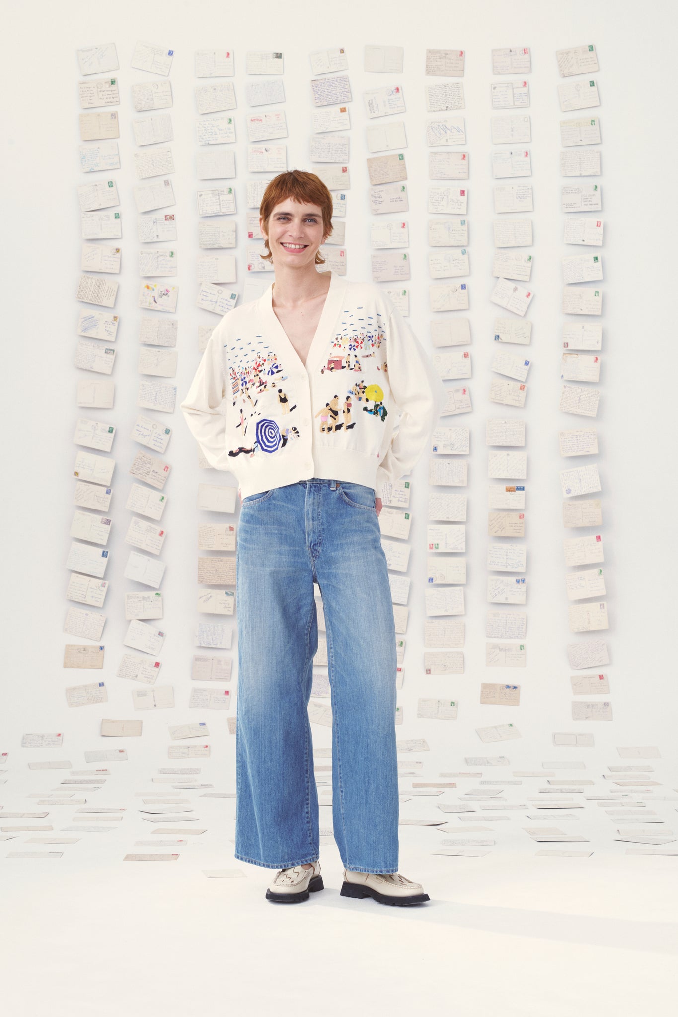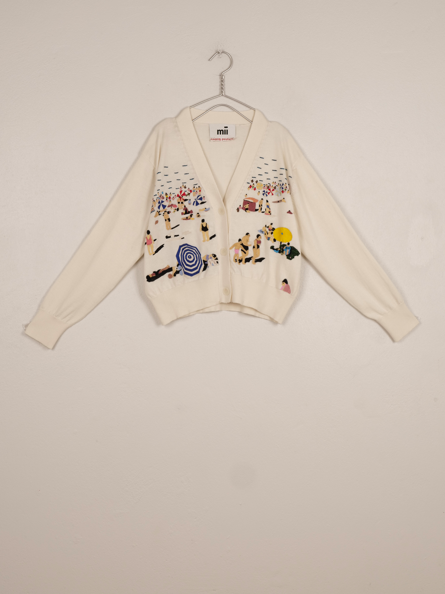The Yaya cardigan is knitted in wool and cotton. Its embroidery, also done by hand, evokes the iconic theme of holiday postcards: summer beach views!