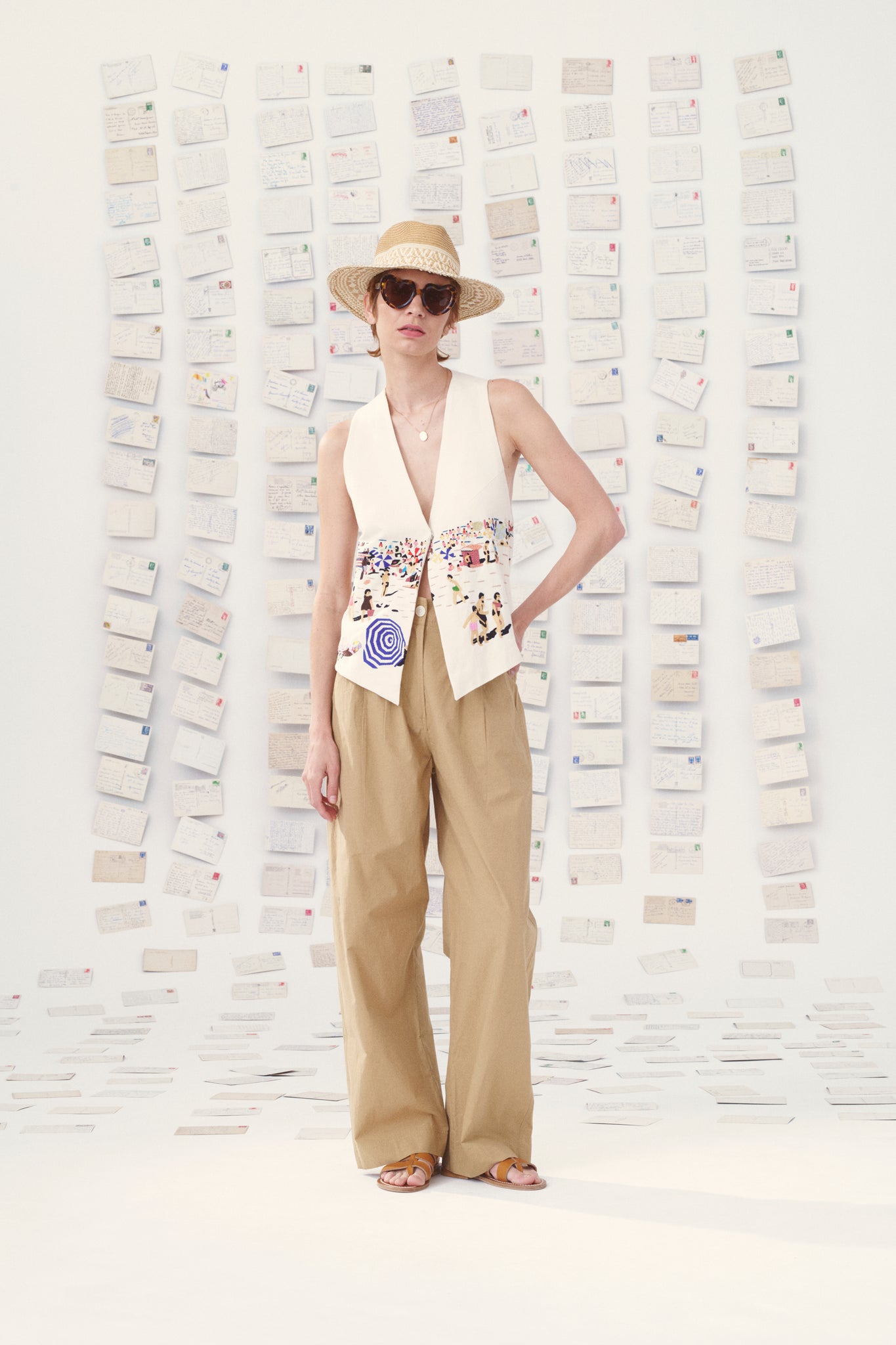 The Paco cardigan is a call to summer, featuring an embroidered summer landscape where deckchairs await us in the sun by the pool. We'd love to dive right in! The embroidery was crafted on linen, adding an interesting texture to this very chic piece.