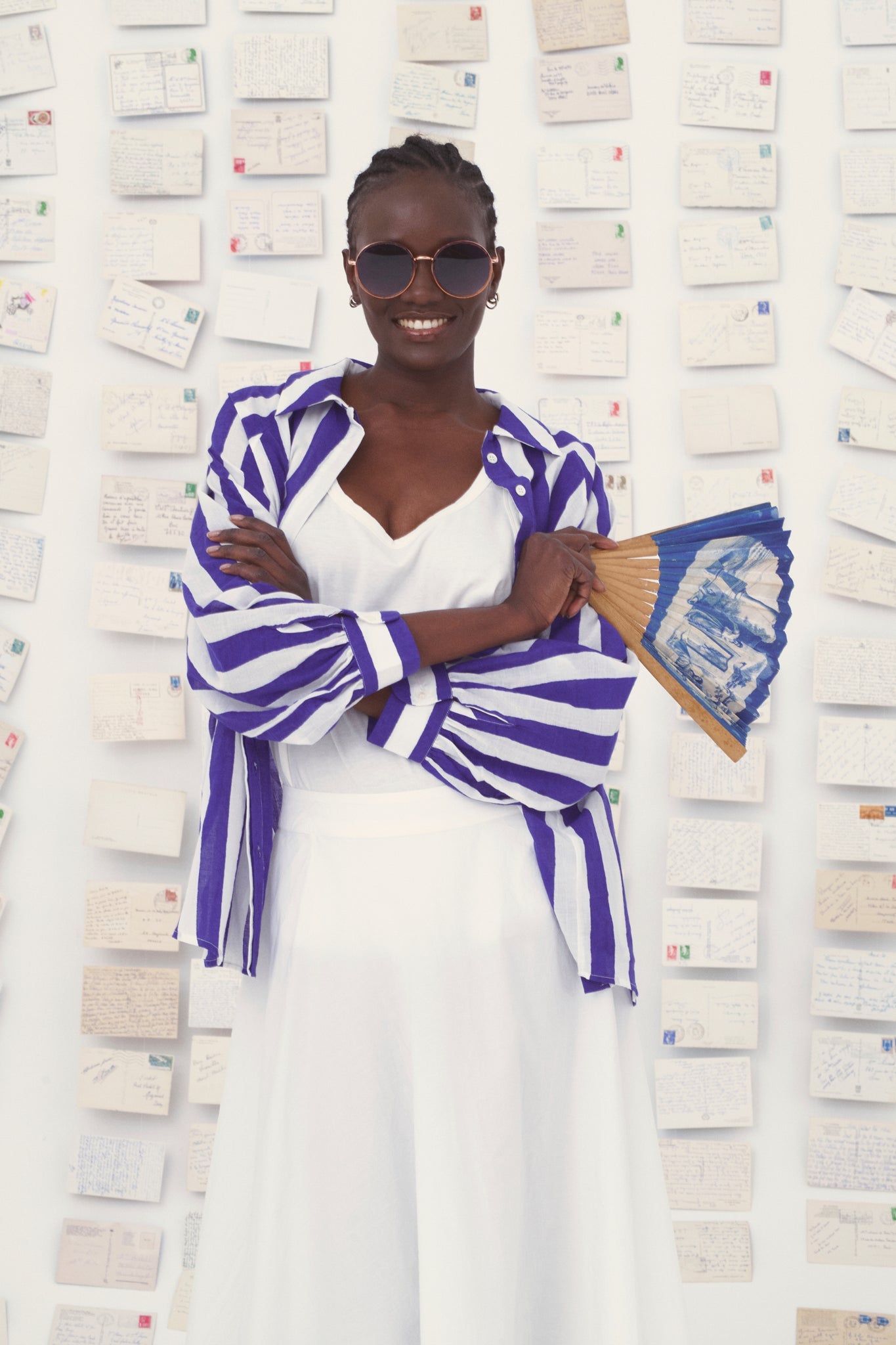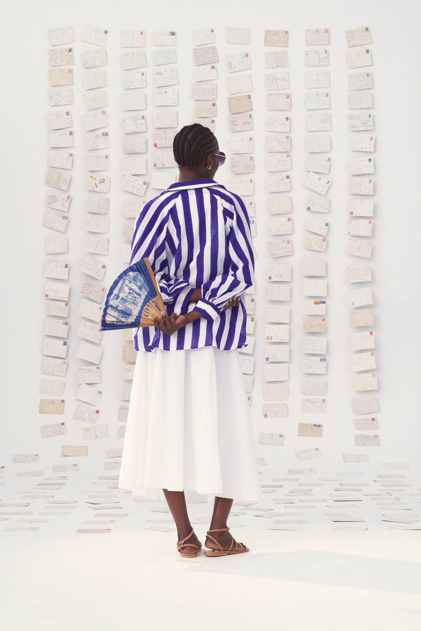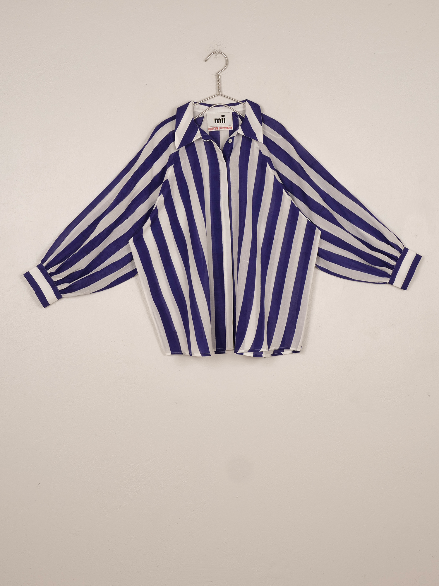 Made using the traditional block printing technique, the long-sleeved Lulu shirt is inspired by the Cyclades. It is available in two colors: cyan/apricot and white/royal blue.