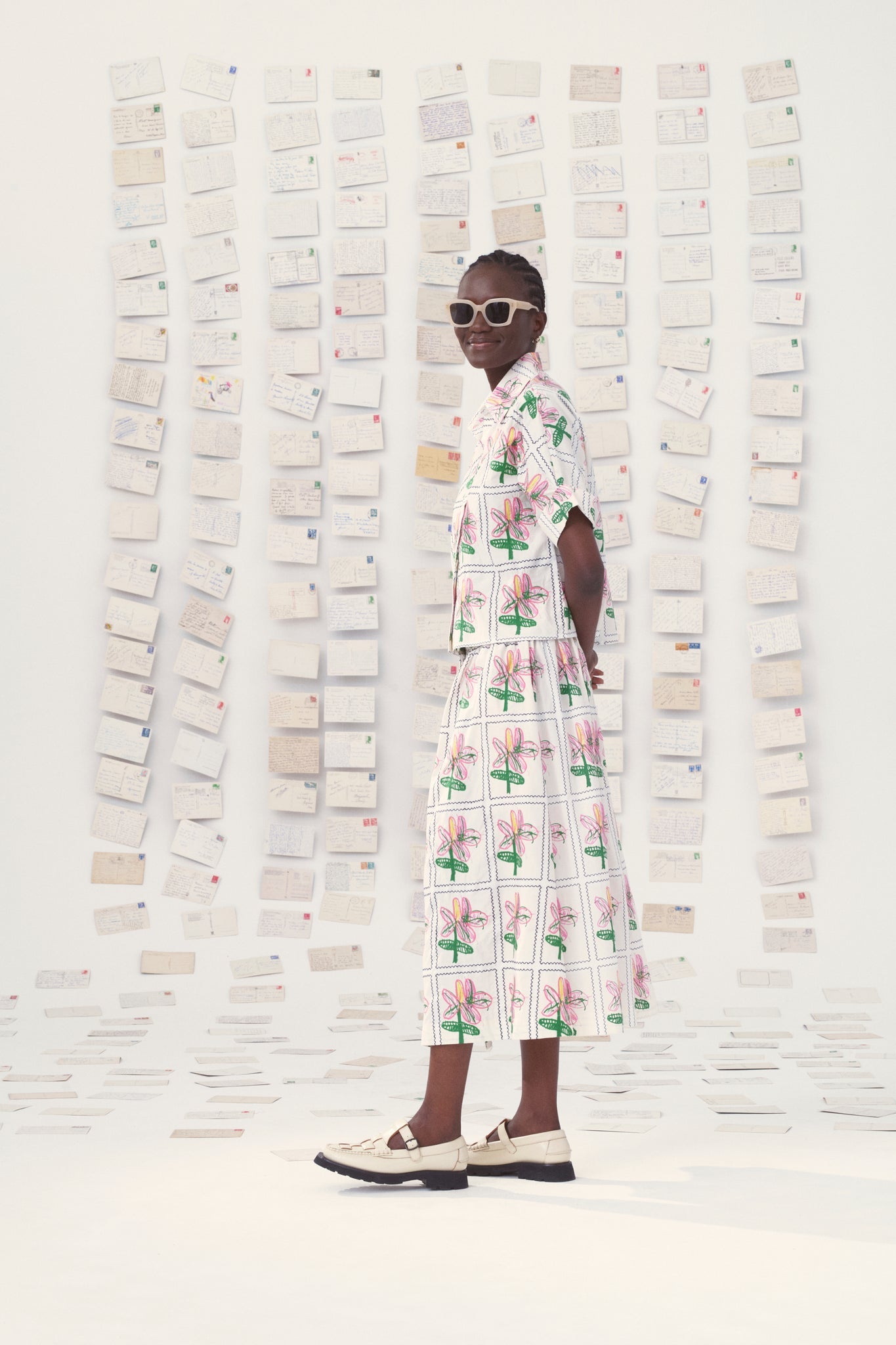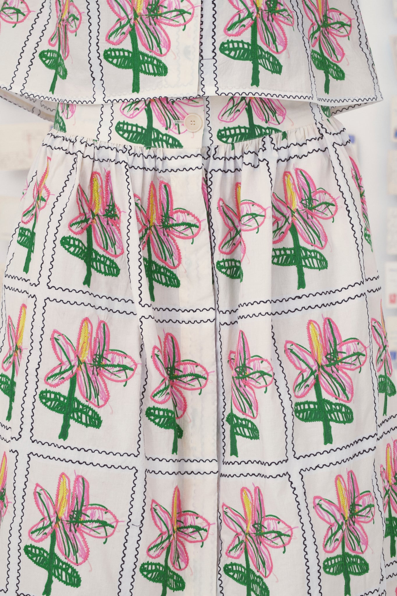 The Mona skirt is made of cotton poplin. Evoking a sheet of stamps, the design is screen-printed and , machine-embroidered. Graphic and modern, it pairs perfectly with the Alba shirt in the same pattern.