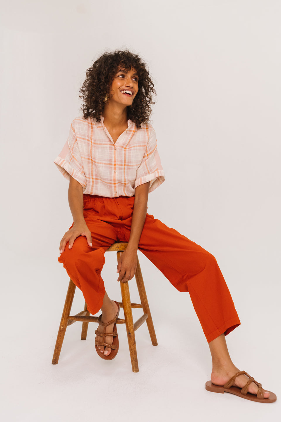 Short-sleeved blouse with a check pattern, highlighted by a yoke on the back and on the collar.Loose, flowing cut, with gathers at the shoulders and back for added lightness.Delicate mandarin collar, exposed buttoning and cuffs on the sleeves for an elegant and structured touch.