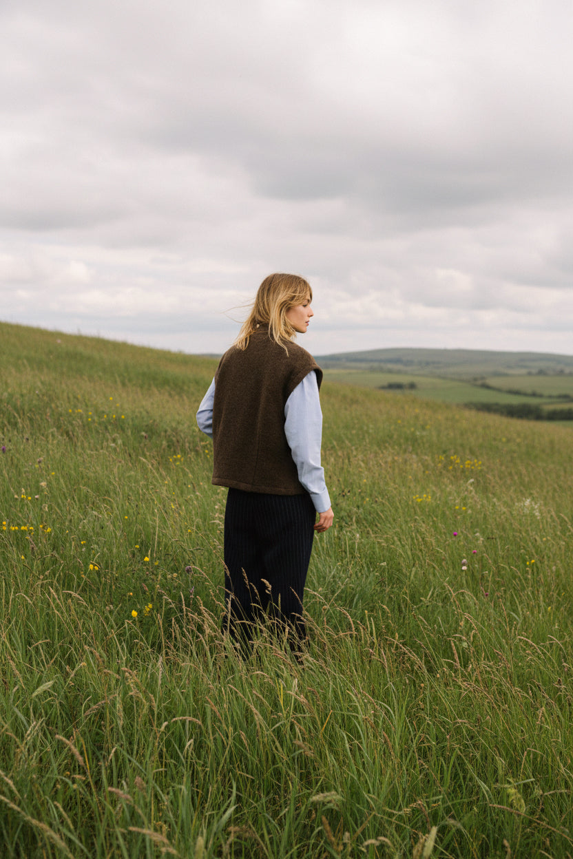 Round jacket without light brown wool sleeves, not doubled for a light and natural worn.Its oversized cut is structured by clips in the lower back and sublimated by a bomber style collar.With large piped pockets and an apparent buttoning, it combines volume, comfort and contemporary look.