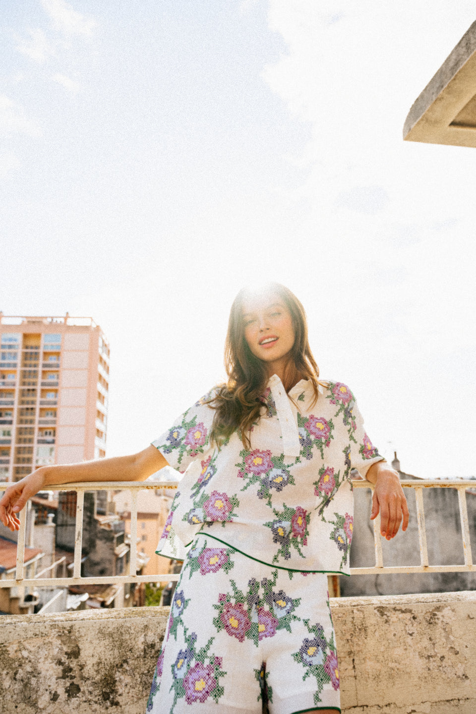 Short-sleeved polo shirt with canvas-style pattern.Cotton collar and button placket for a structured, contrasting touch.