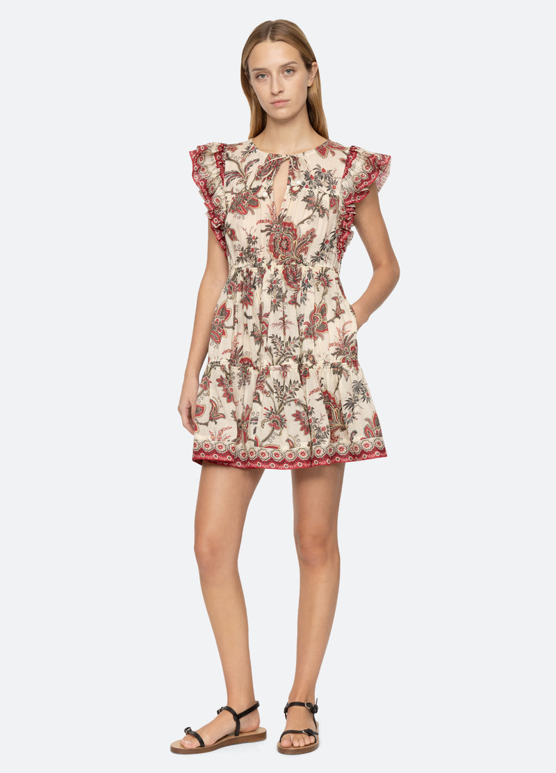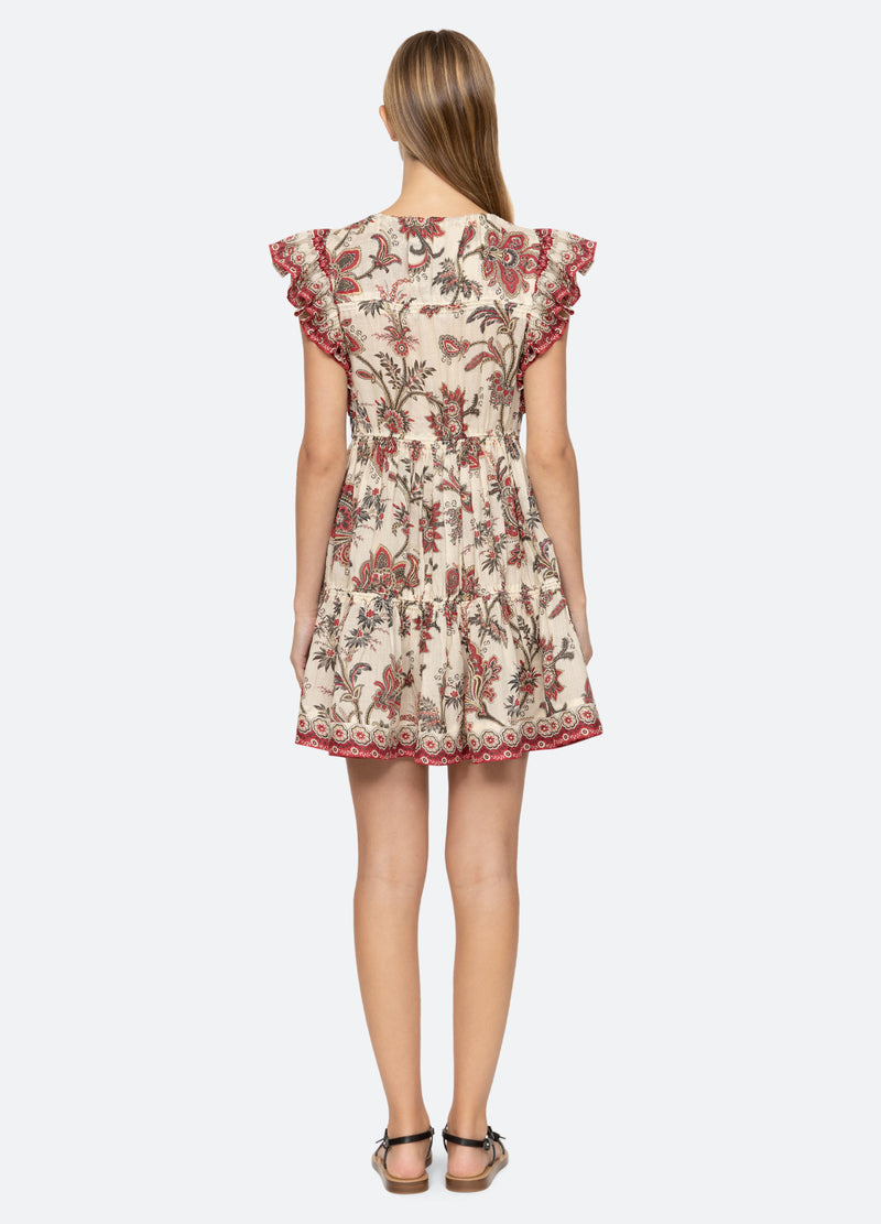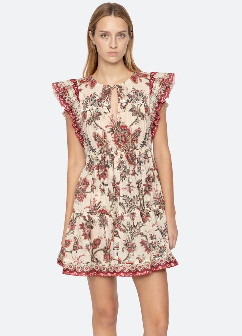 The Cassandra floral paisley print tunic dress features flutter sleeves, tassel neck ties and mini silhouette.