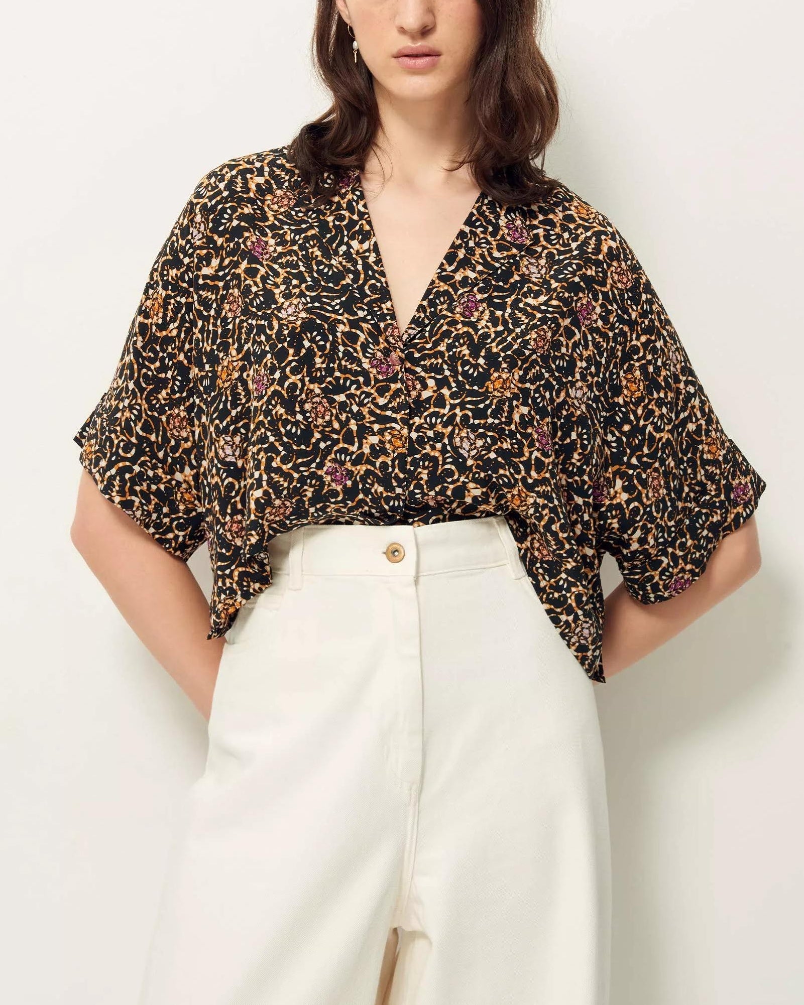 Shorts, pajamas-style shirt in a lightweight fluid viscose print fabric, exclusive Sessn pattern.
