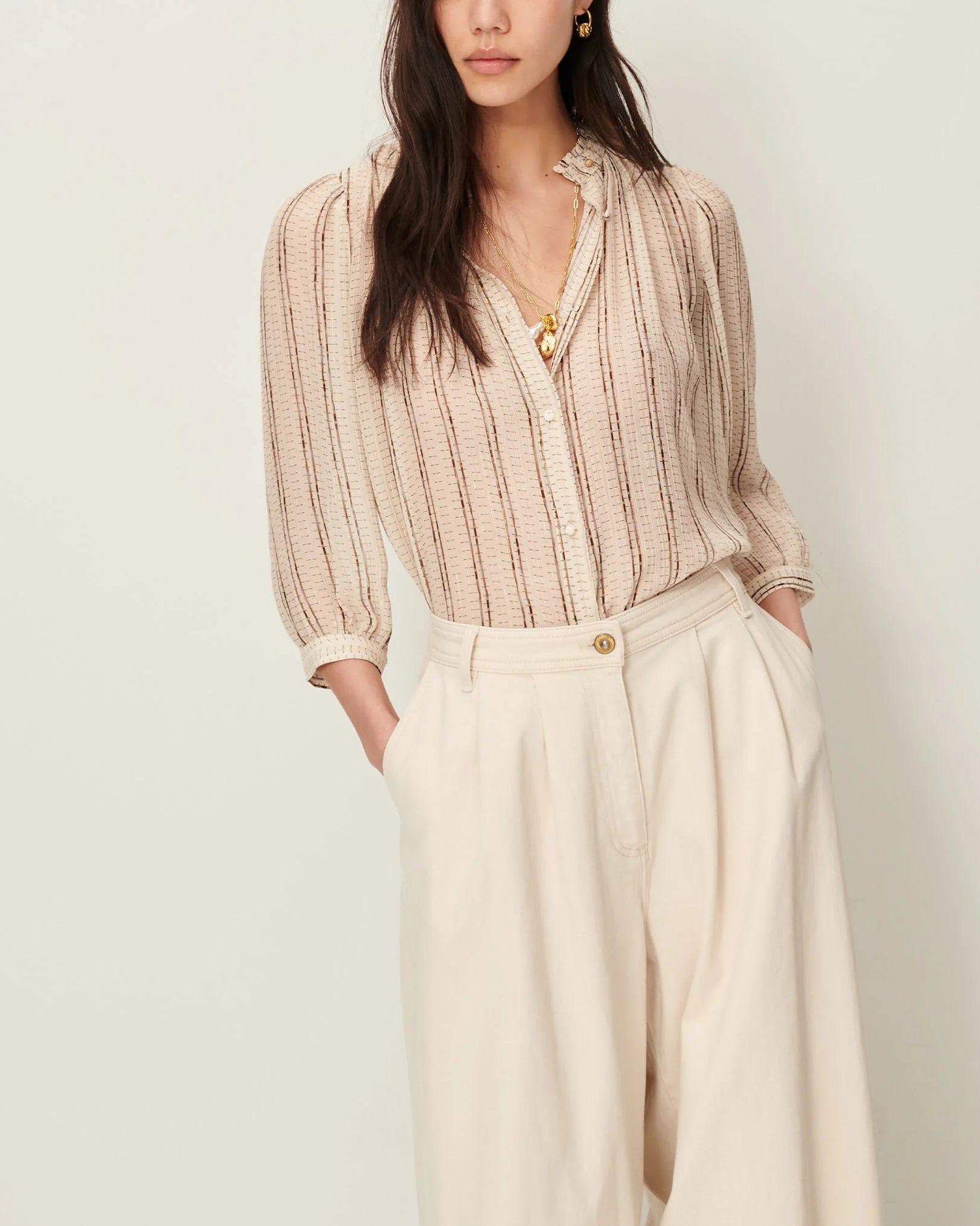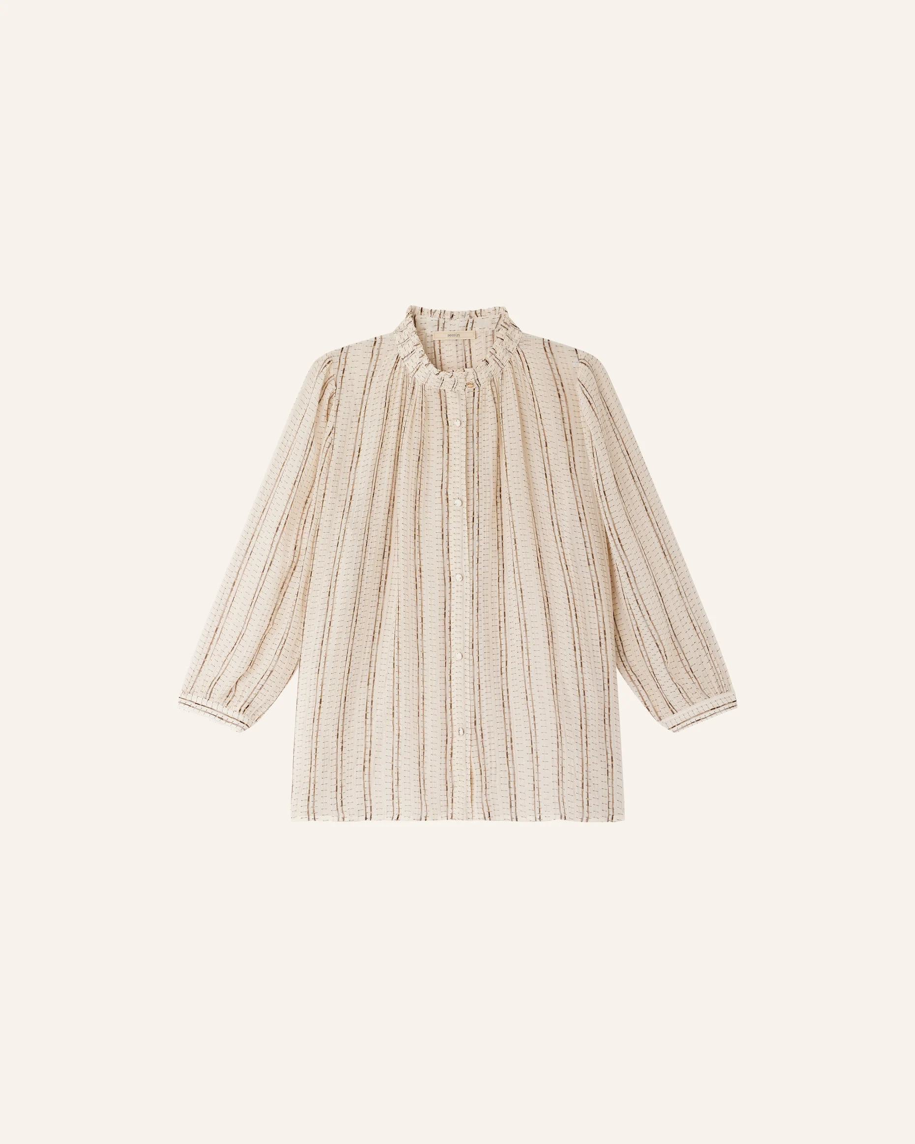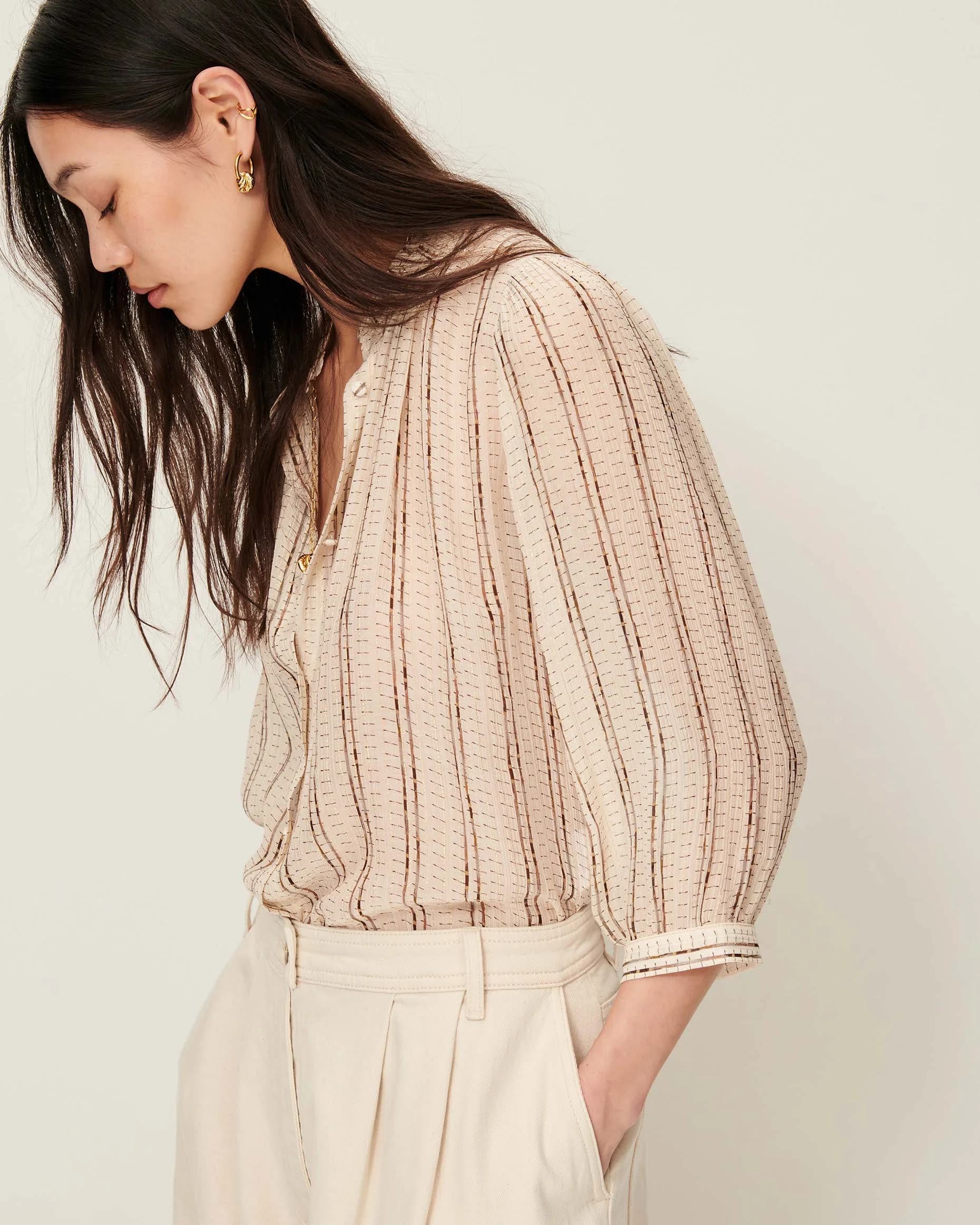 Ruffled collar and balloon sleeves blouse in printed thin metallic striped silk viscose creped chiffon, exclusive Sessn pattern.