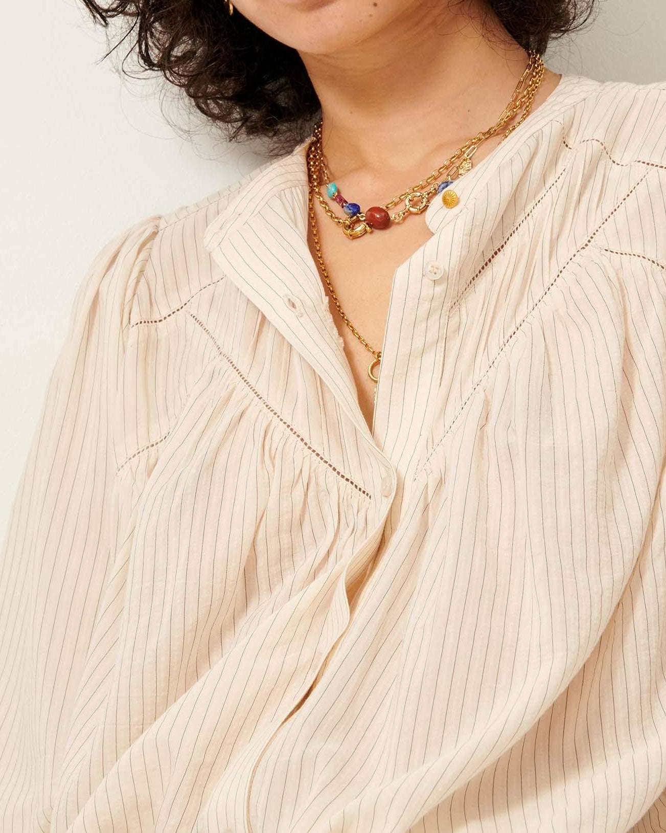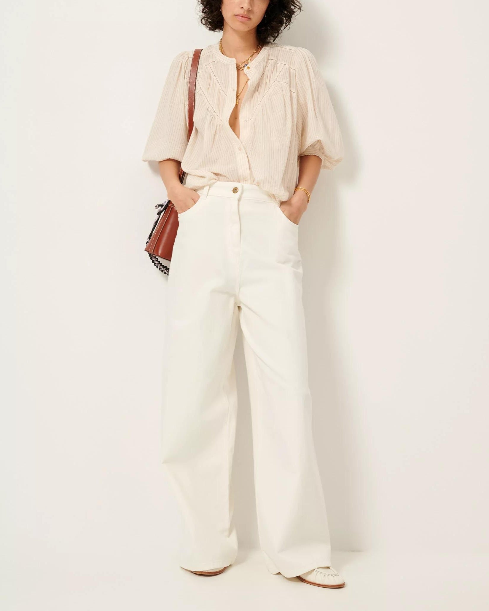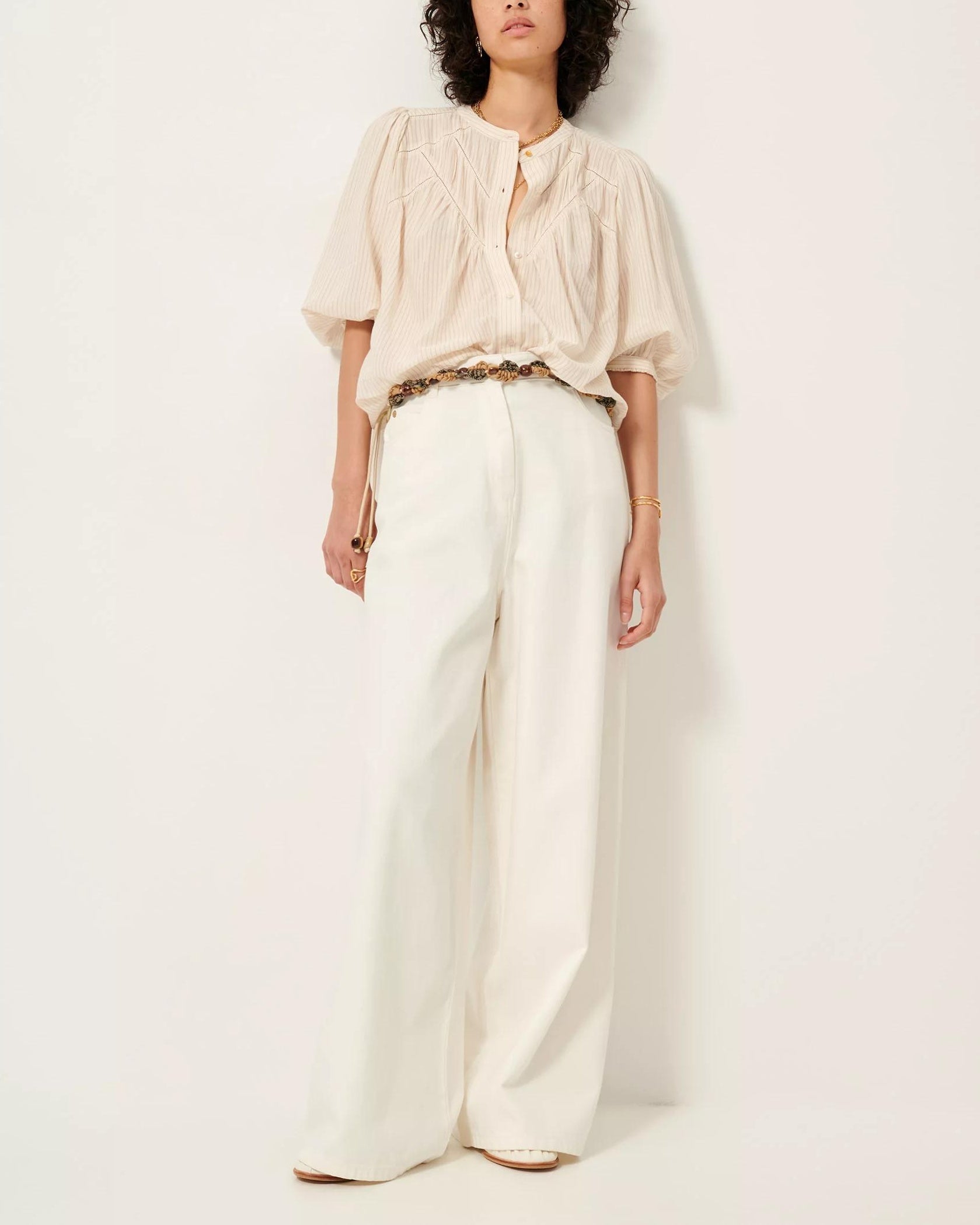 Balloon sleeved blouse with ladder openwork and mini knife pleats in a textured jacquard lawn fabric with fine contrasting stripes.