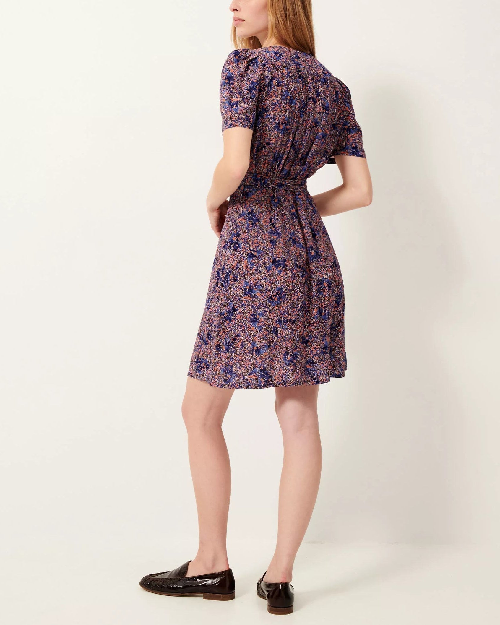 Short, button-up dress in a lightweight, fluid viscose print fabric, exclusive Sessn pattern.