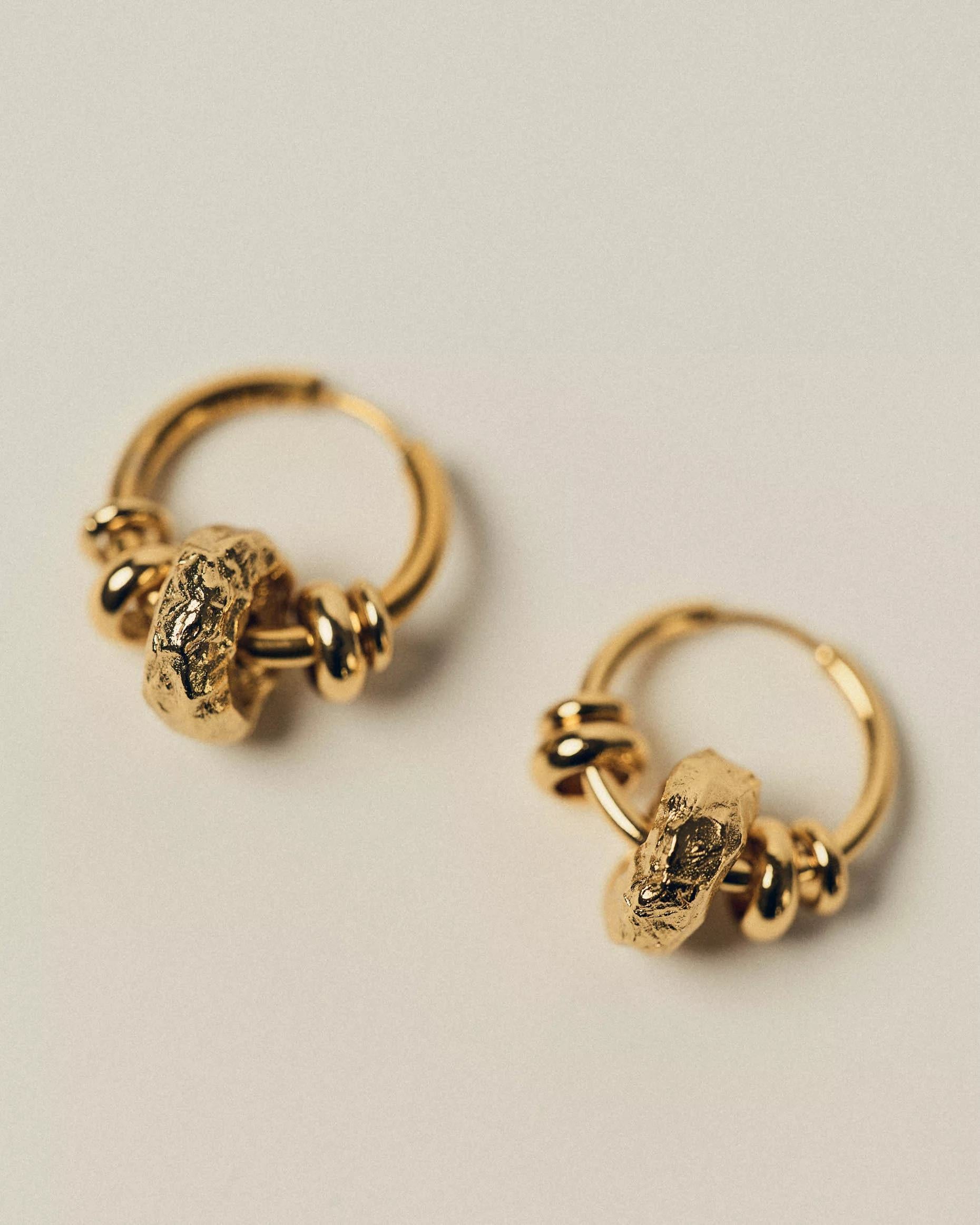Gold hoop earrings with hoops of varying sizes. Smooth and textured finish.