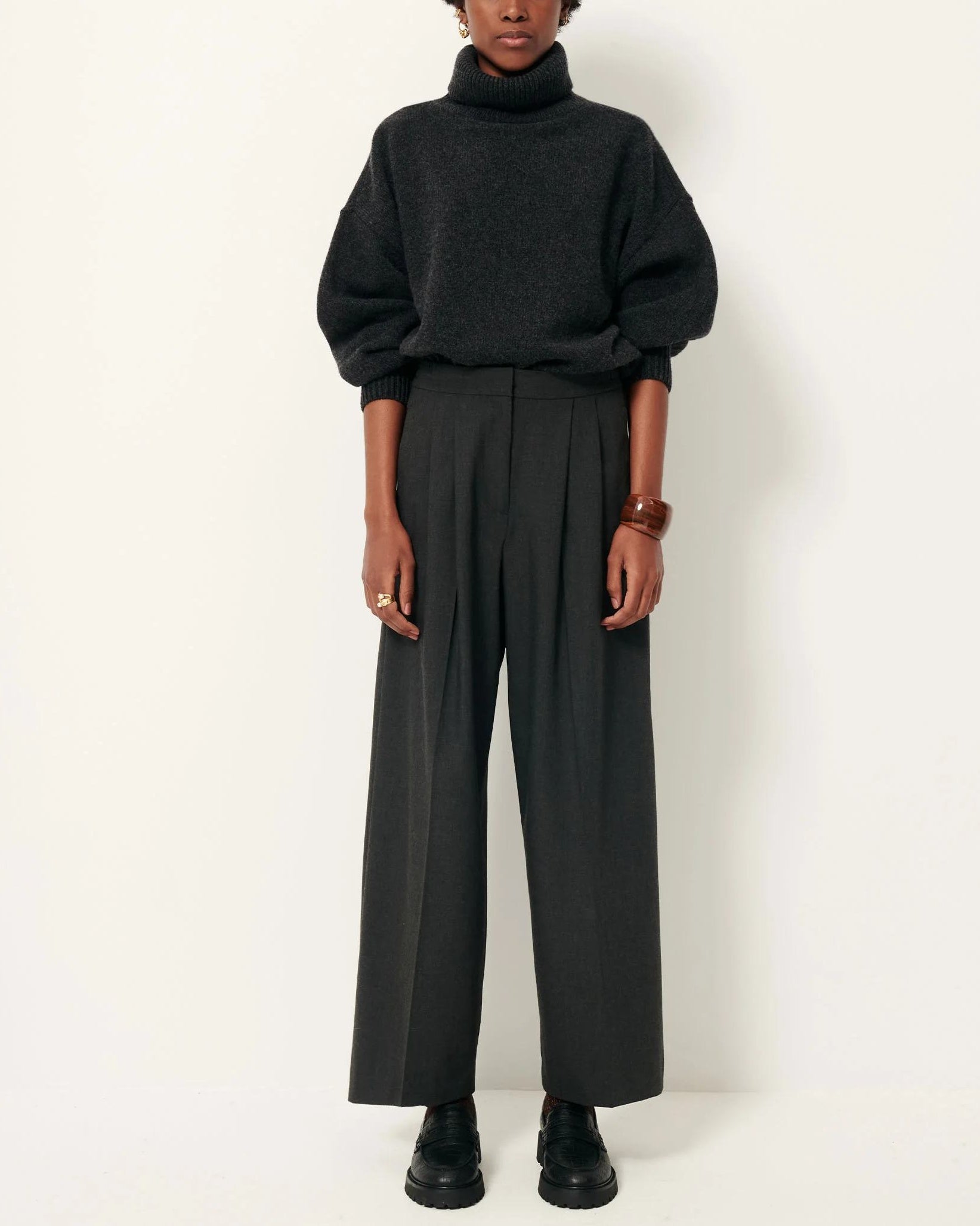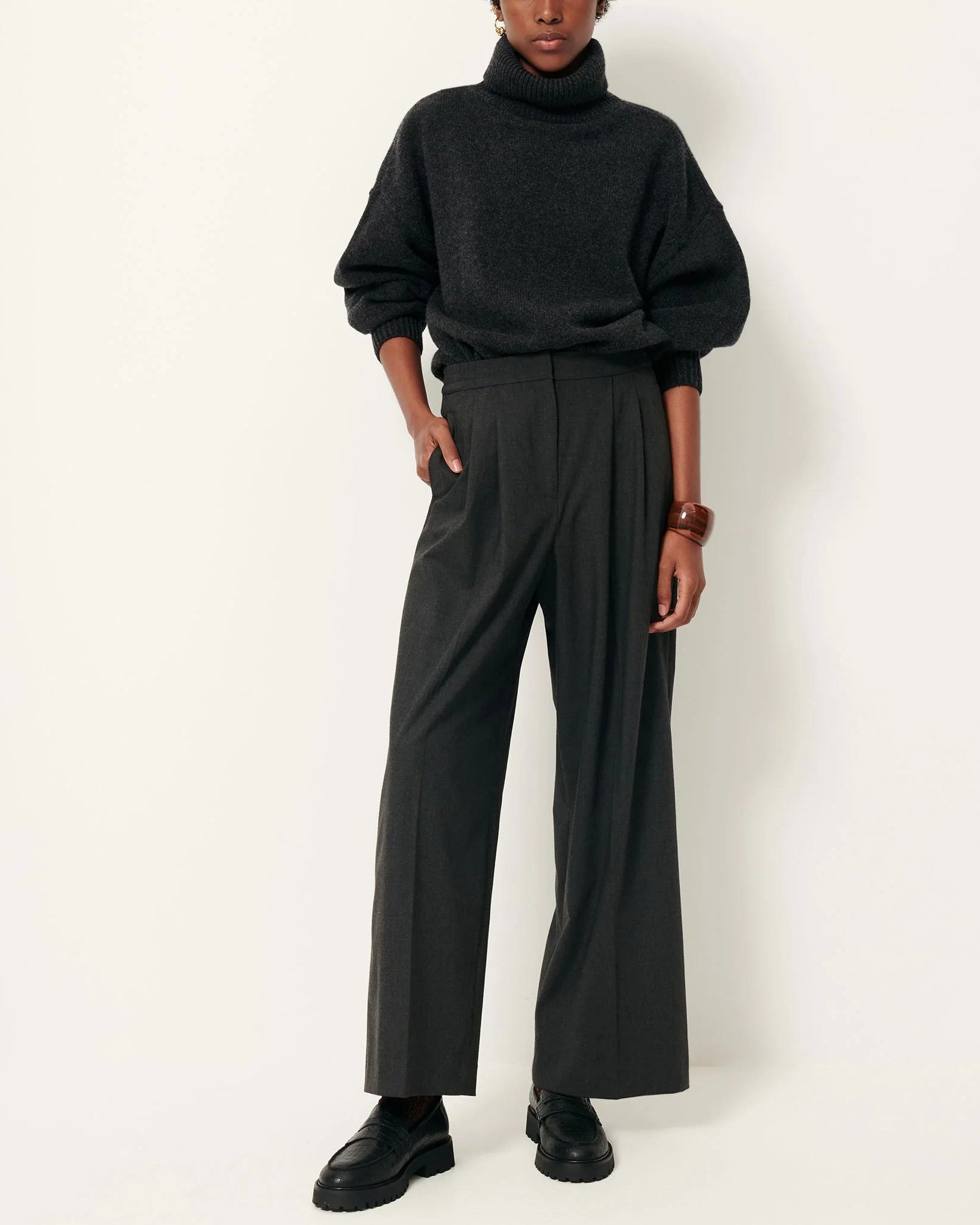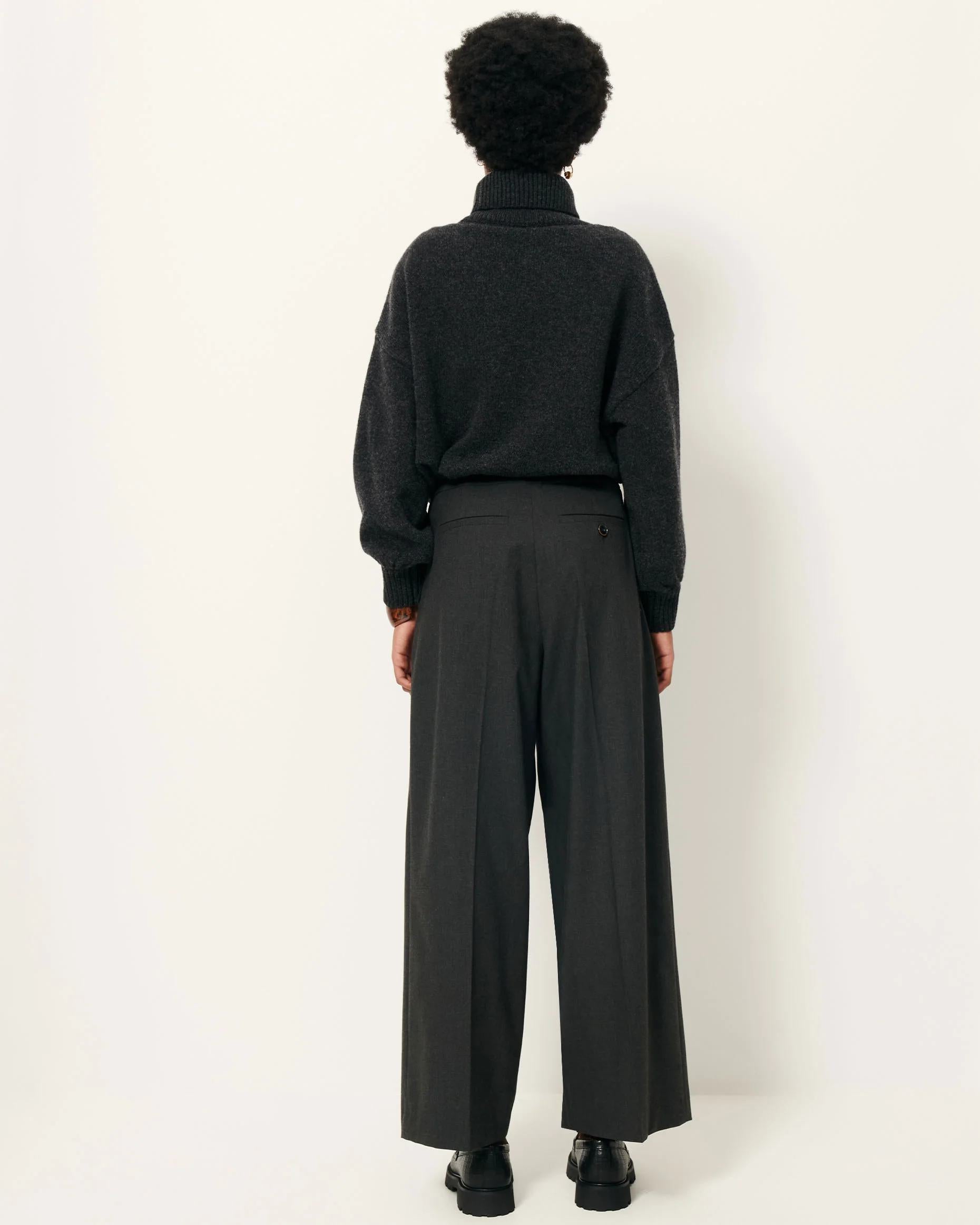 Straight-leg trousers with knife pleats at the waistband in fluid, chambray suit fabric with a light stretch, woven in Bulgaria.