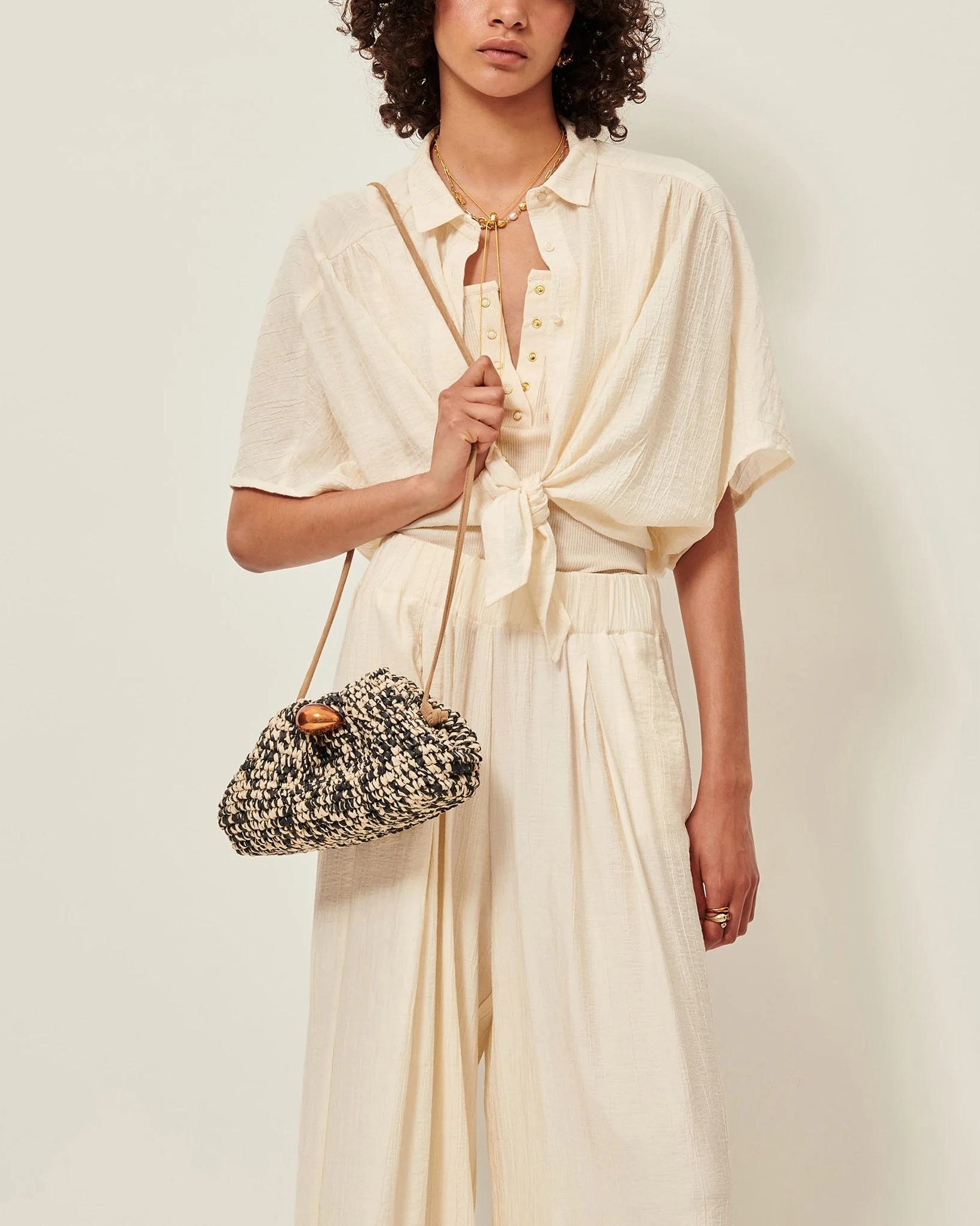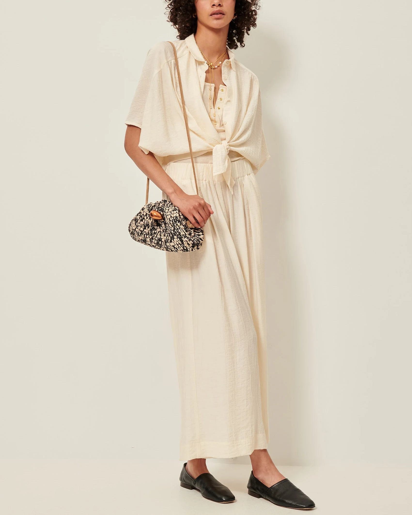 Short blouse with a tie front in antique-style lawn with fine stripes in fancy gradient-dyed knop yarn, woven in Italy.