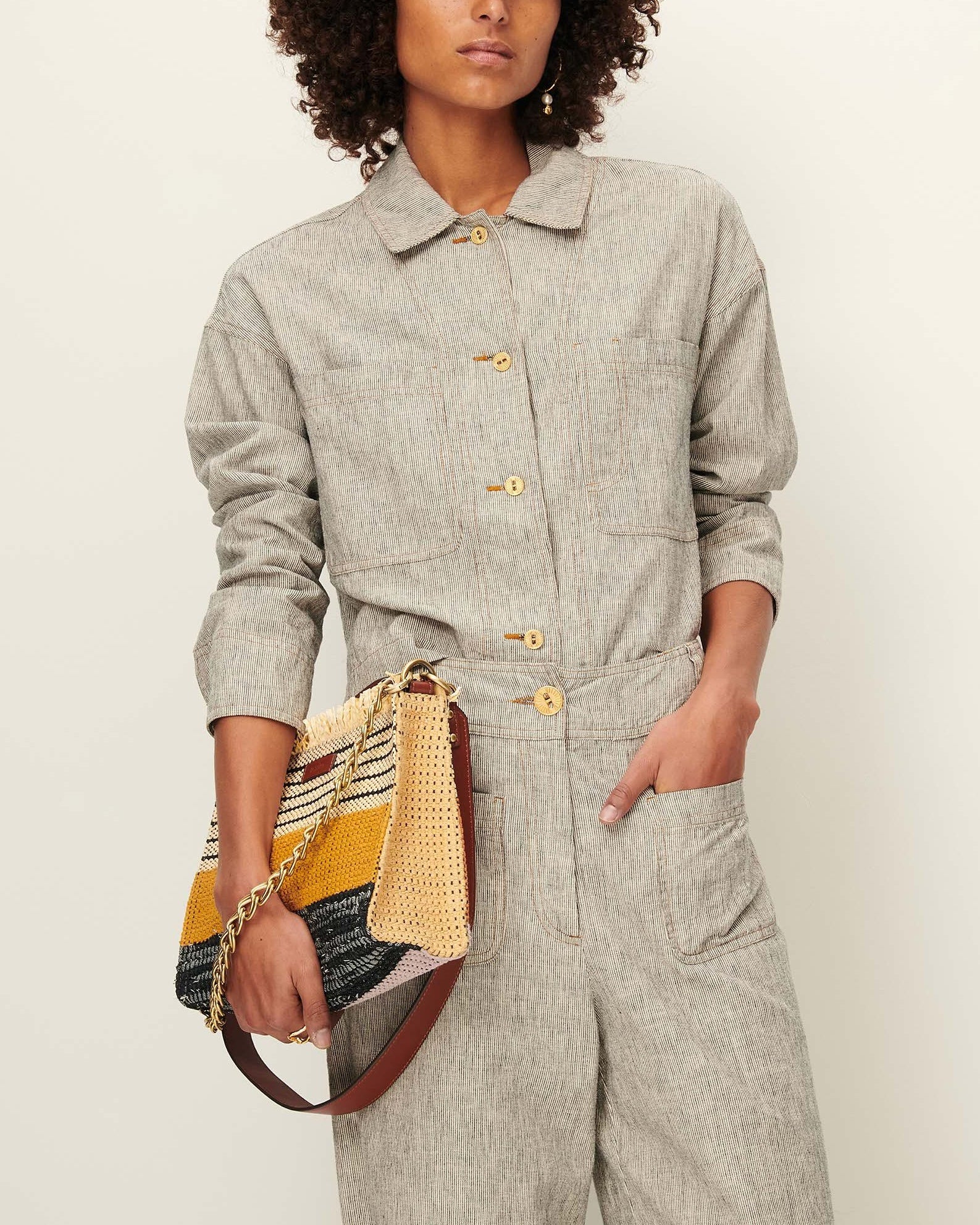- Fabric: cotton-linen slub yarn blend with a two-tone striped, textured weave
