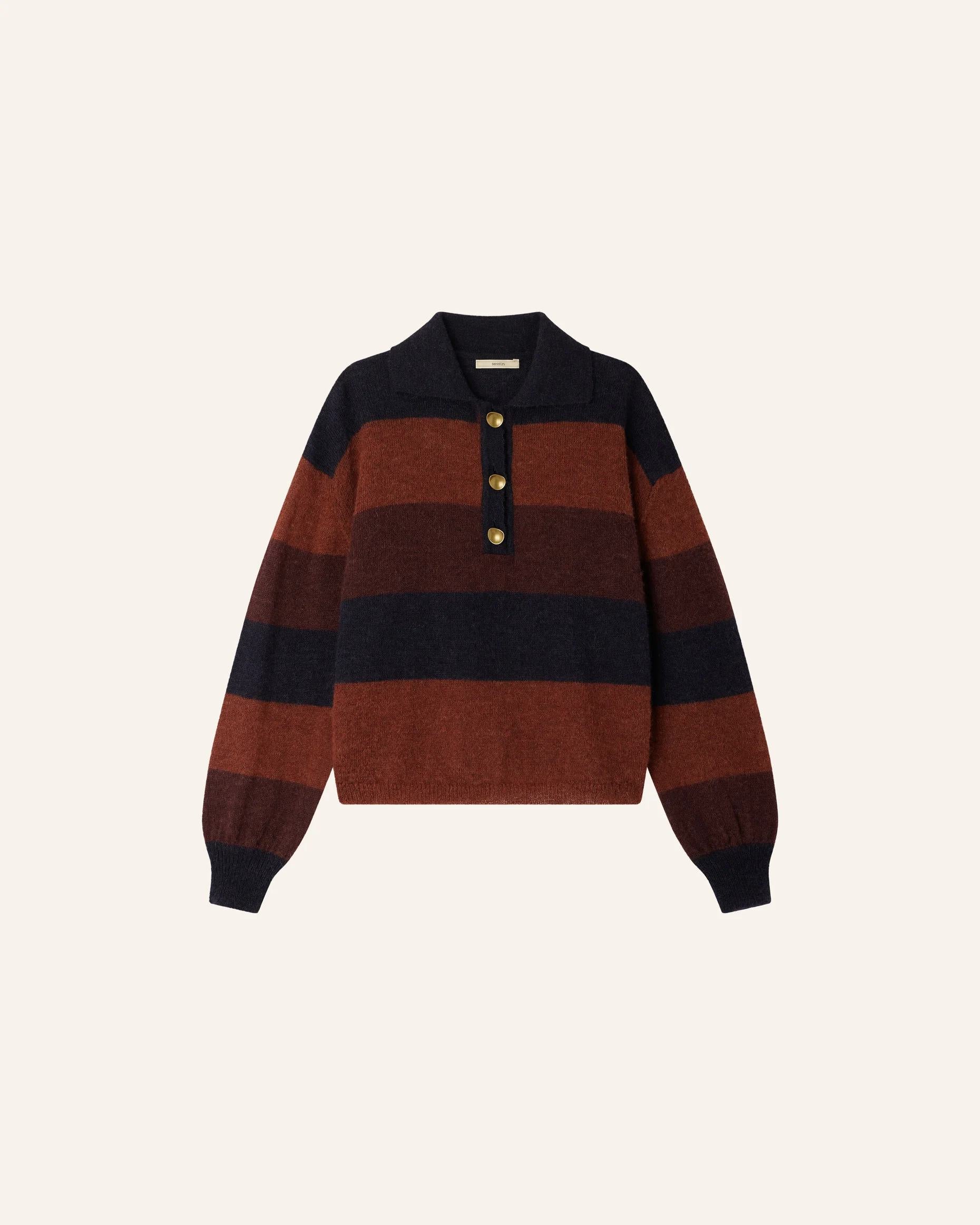 Striped long-sleeve polo-style sweater in a fluffy jersey knit, knitted in Italy.