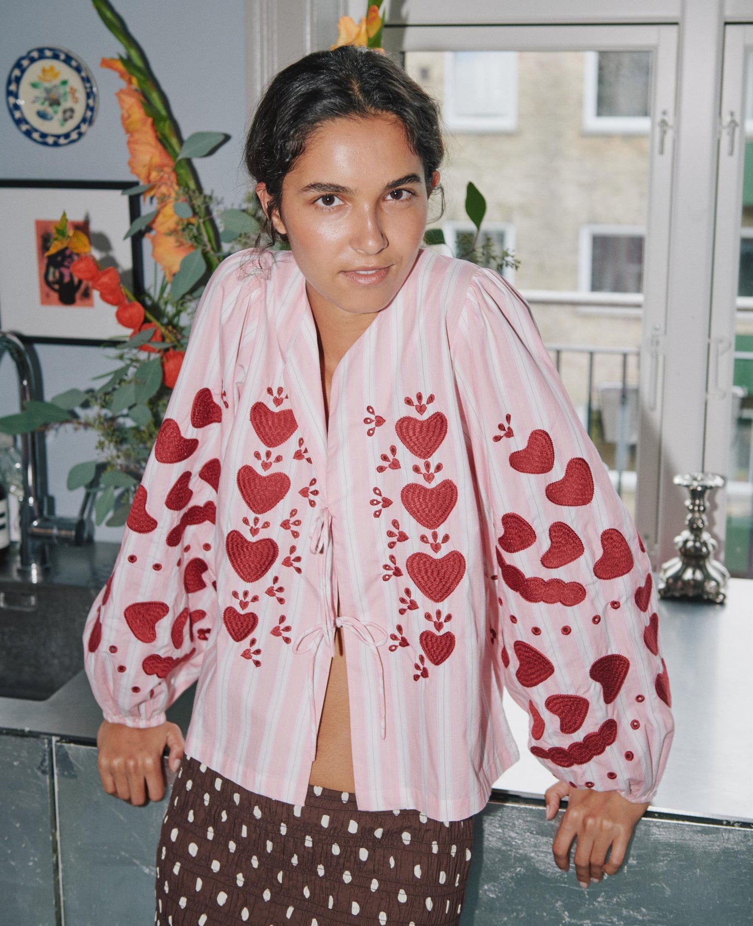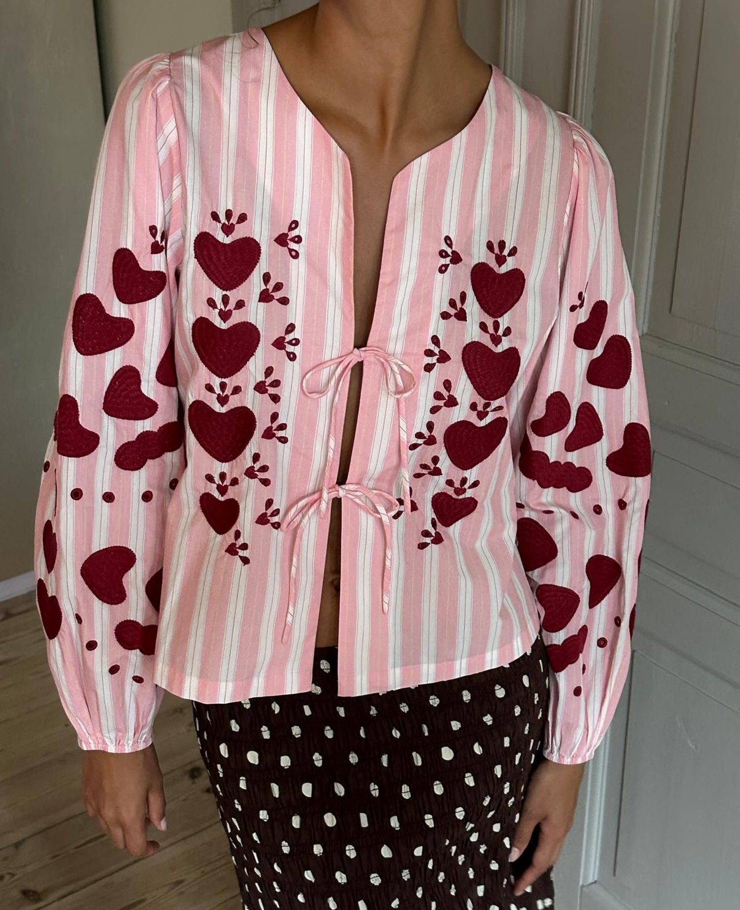 The Elisabeth Top is crafted to feel as good as it looks. Made from 100% organic cotton poplin, it stays light and breathable through warm days and changing office temperatures. The open front invites you to tailor the neckline with two slender bow strings, while voluminous sleeves gather softly at the elastic cuffs, creating a flattering silhouette that moves with you. A subtle heart embroidery at the chest and on the sleeves adds a touch of whimsy, making this blouse feel personal and unique rather than generic.