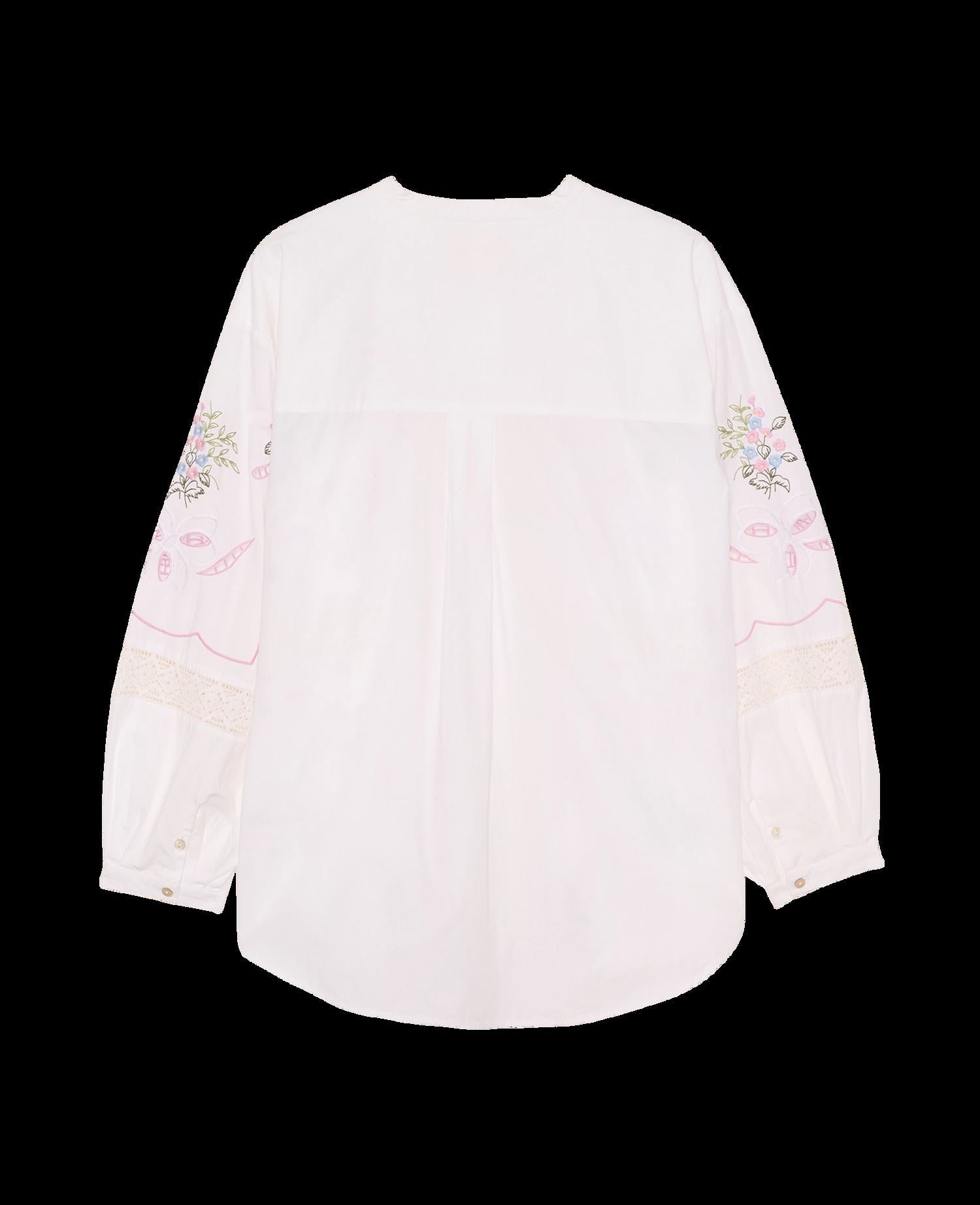 Sada Shirt has a loose, straight fit and is made in organic cotton. It features long sleeves with buttoned slim cuffs and an o-neckline with a slim stand collar that lays gently around the neck. The front placket is finished with mother-of-pearl buttons for closure. A yoke with a box pleat at the center back adds ease to the fit, while the curved hemline softens the silhouette. The shirt is decorated with poetic embroidery inspired by a vintage tablecloth and detailed with beautiful lace tape.