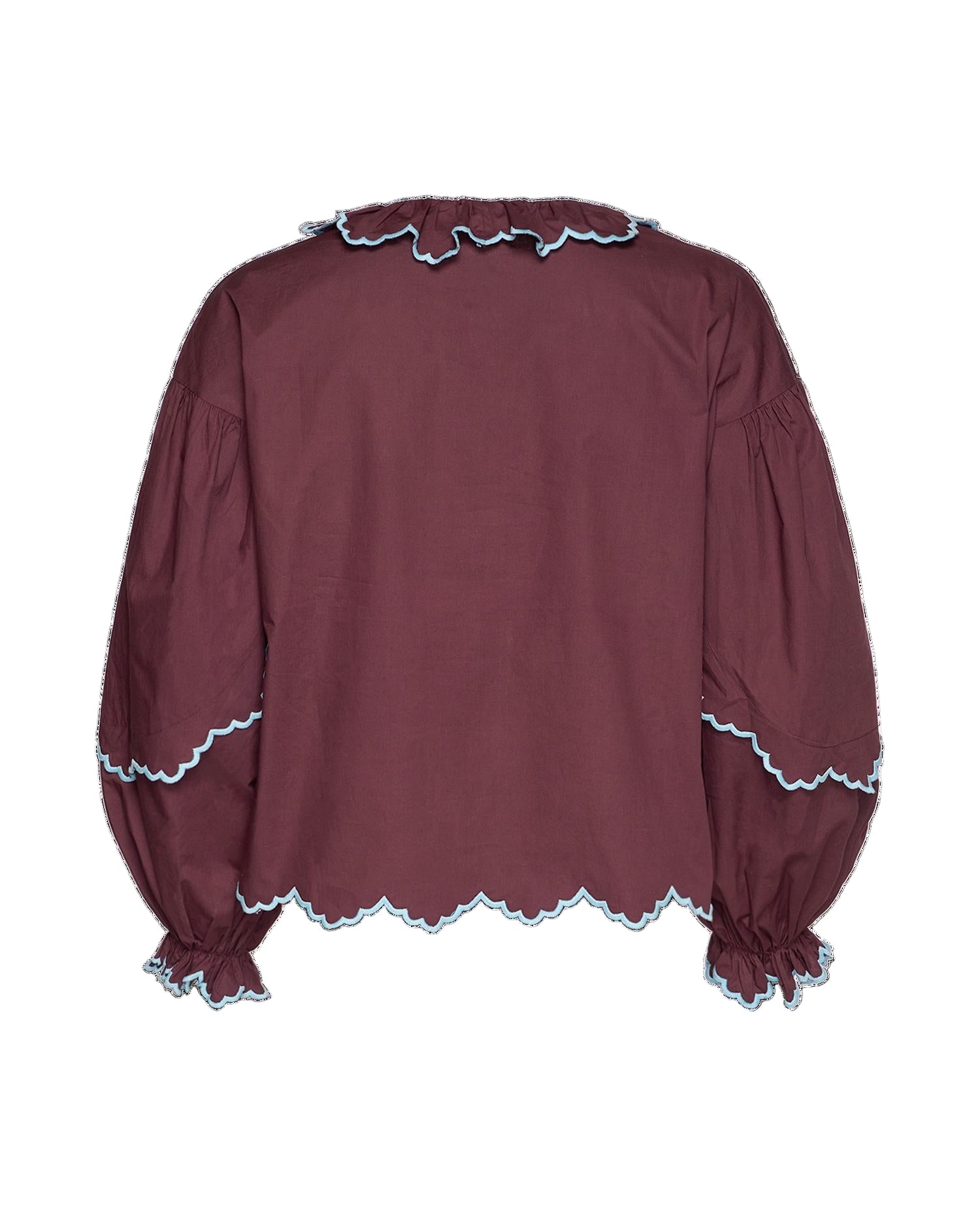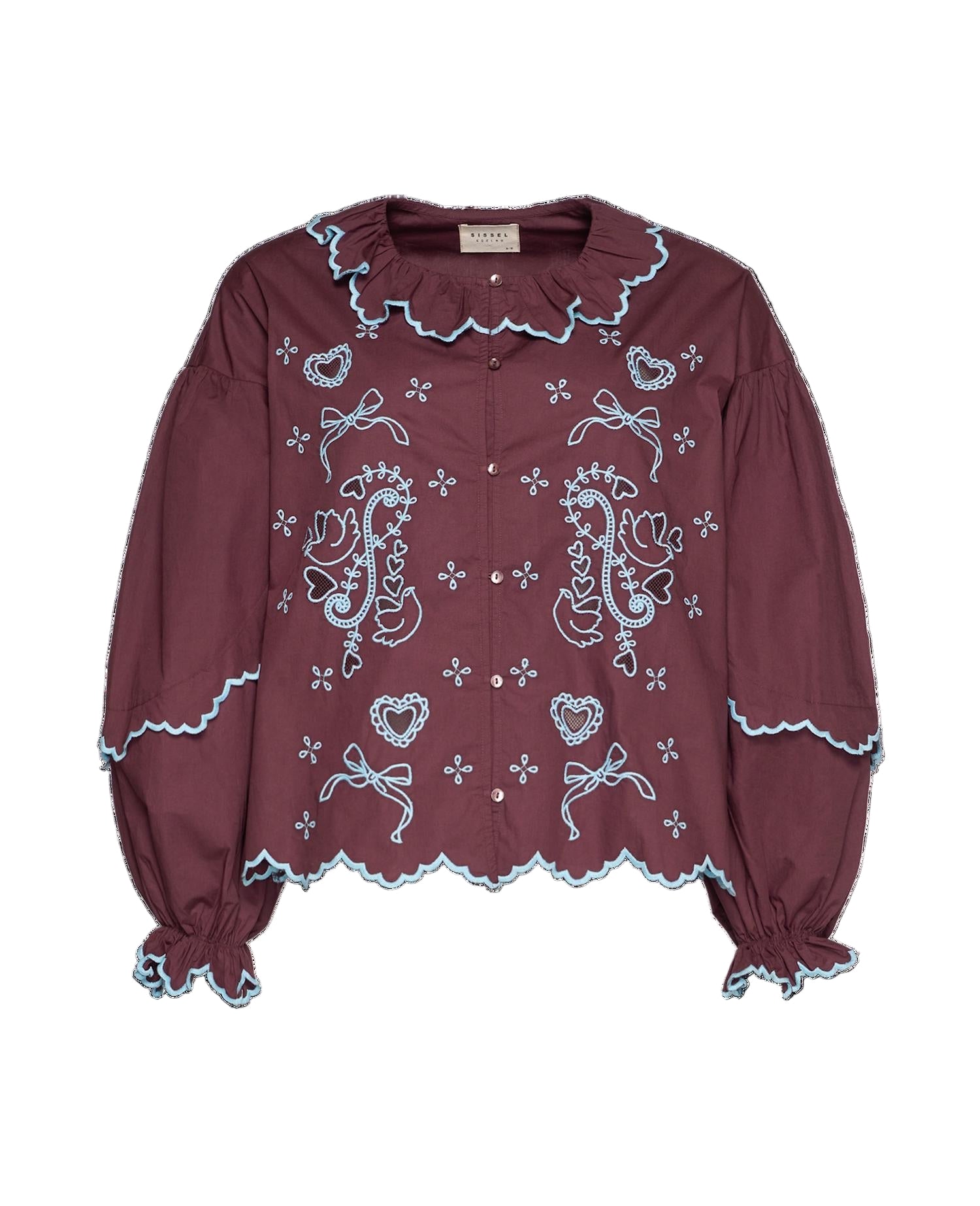 Tone Shirt has a casual, feminine fit and is made in 100% organic cotton. The sleeves are long and voluminous, with an elastic tape in the sleeve cuffs that creates a small frill. The neckline is round and features a small ruffle collar. The shirt closes at the front placket with dark mother-of-pearl buttons and elastic loops. It is beautifully adorned with poetic cutwork embroidery, consisting of motifs such as birds, hearts, and bows, along with embroidered scalloped edges in a contrasting color.