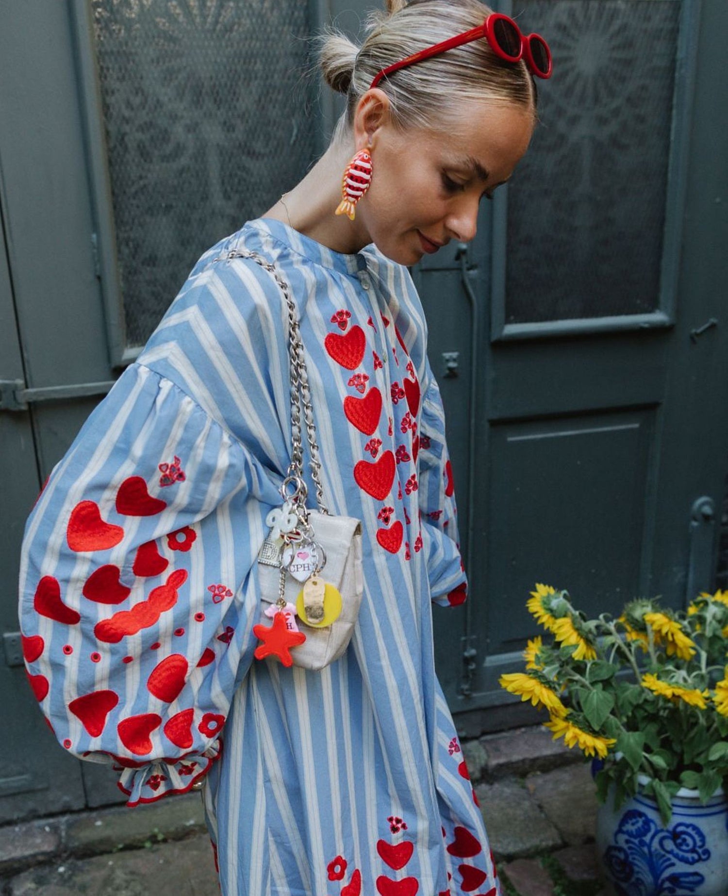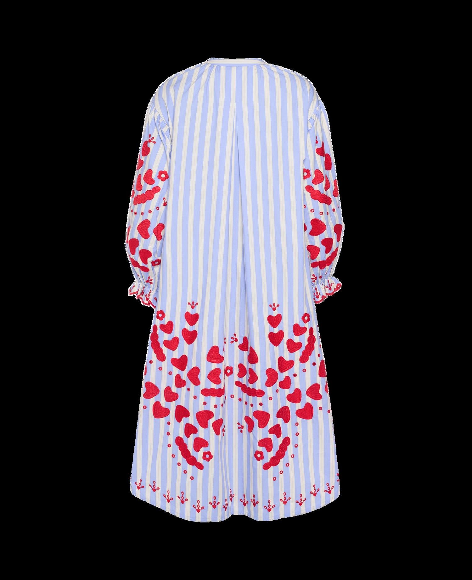 Elisabeth Dress is a casual, yet feminine dress made in 100% organic cotton poplin. The dress has dropped shoulders with ruffles along the armholes. It has voluminous sleeves with gathers and small cuffs at the sleeve opening. The collar has gathers around the neckline and you will find mother of pearl buttons at the front placket. At side seams pockets are placed. The dress is decorated with our significant heart embroidery, which is delicately placed at the chest, hem, sleeve frill and at the lower part of the dress.