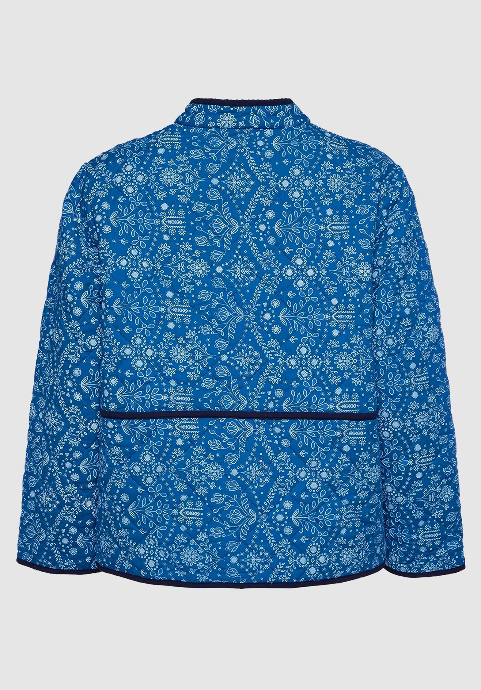 Adriane Jacket features a beautiful casual silhouette jacket. The jacket is light padded and quilt stitched. The jacket has a small collar and is made with pockets front and wooden buttons in placket front. All edges are nicely covered with cotton bindings. This jacket is made in a beautiful mix of printed leftover cotton fabrics.