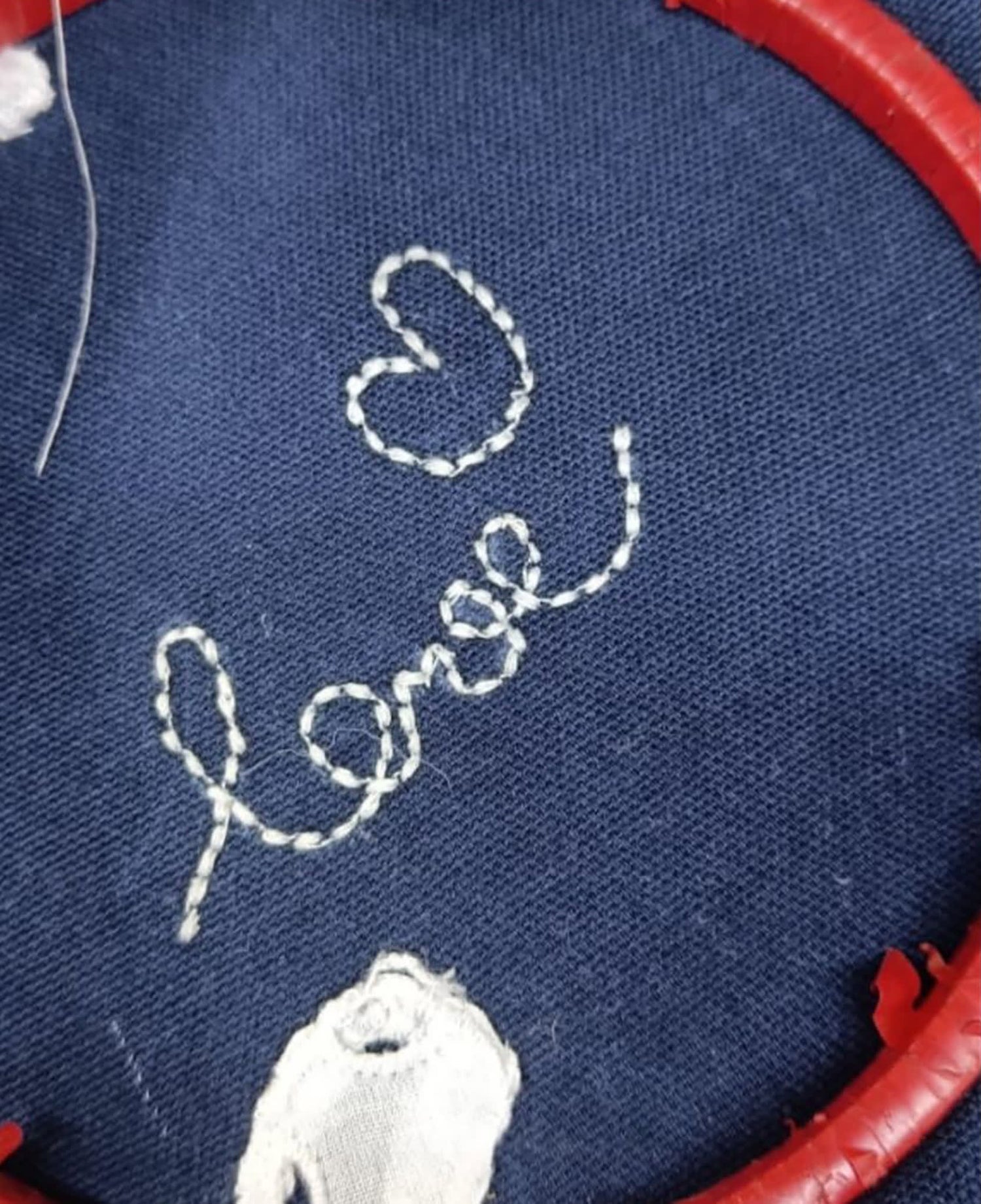 It has an O-neckline and a front placket with wood buttons. The jacket includes pockets sewn on the front and is richly decorated with delicate embroidery and charming handmade appliqu motifs, such as elephants, birds, and flowers, crafted from broderie anglaise.