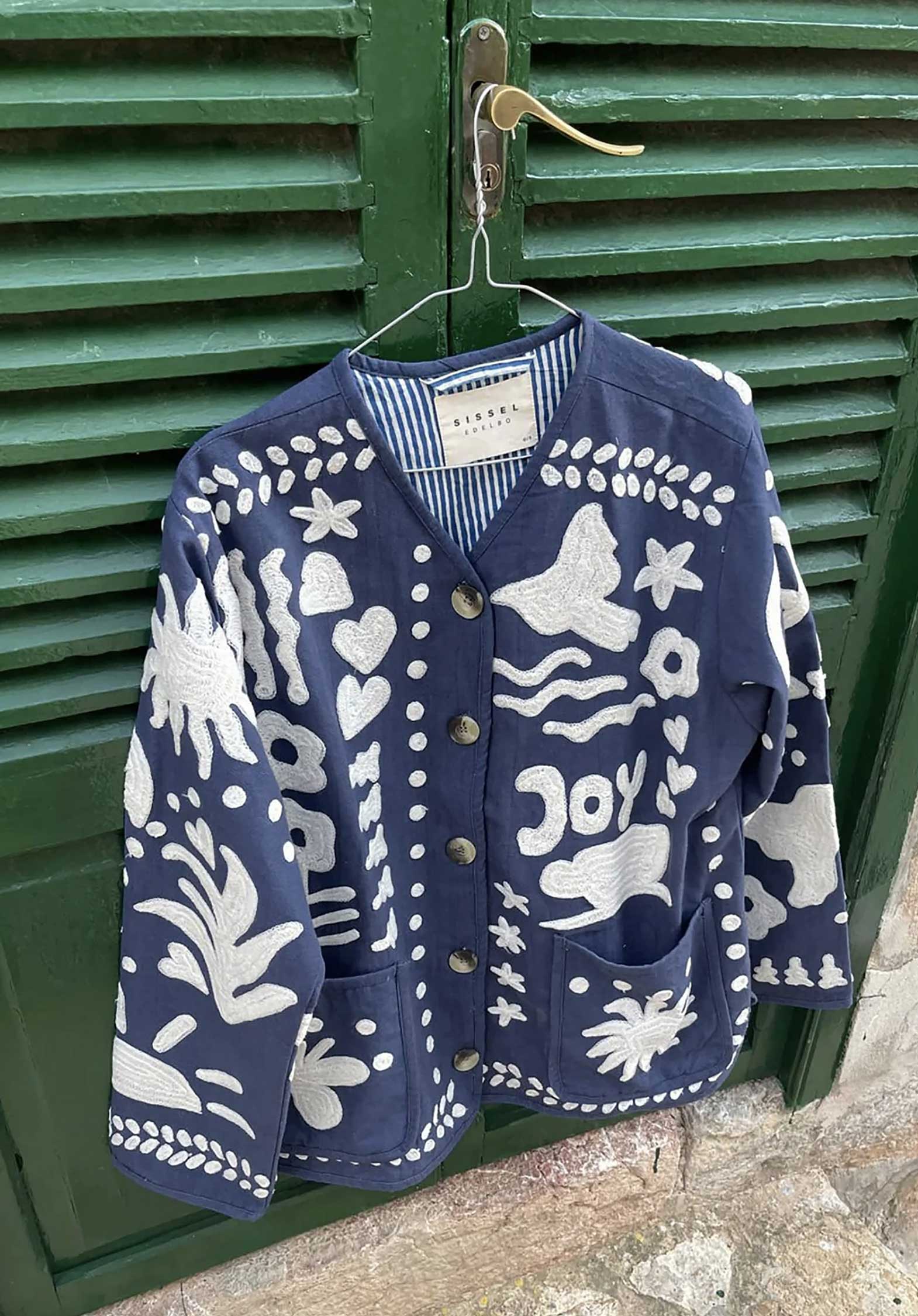 Maggie Jacket features a cotton canvas jacket with our significant Suzani embroidery. The jacket has pockets at front and buttons at center front placket. On our Maggie Jacket the Indian Suzani inspiration is present in our embroidery designs where traditional Indian motifs have been mixed with universal and contemporary symbols as hearts, LOVE, and flowers.