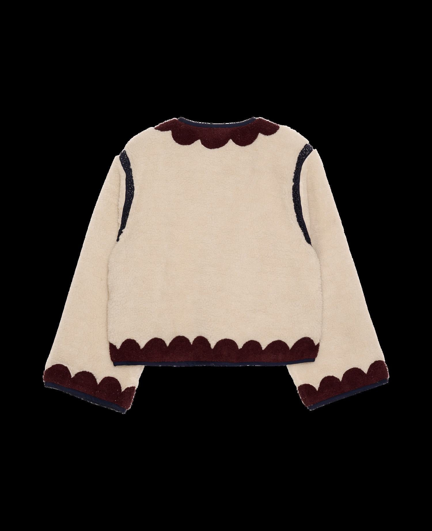 Tamara Jacket is a short, casual jacket made in teddy fabric with suzani embroidery. It has long straight sleeves, a curved neckline, and can be closed by two sets of tie strings at the front placket. The jacket is finished with floral lining made in leftover cotton and bindings covering the edges. It is decorated with voluminous, eye-catching suzani embroidery placed along the edges and on the two front pockets, and the armhole seams are highlighted with delicate cotton lace tape.