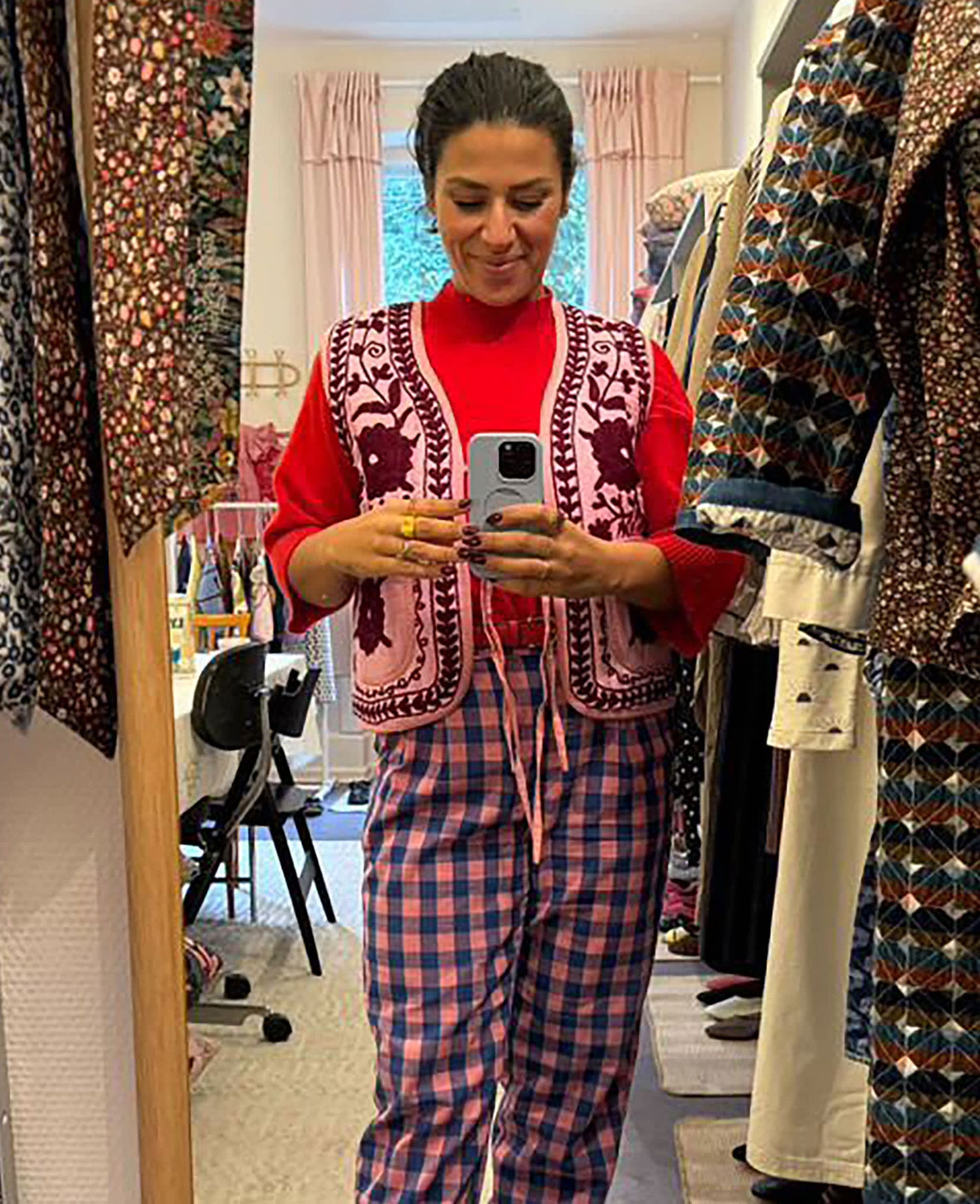 Honey Vest is a cute cotton vest decorated with bold and bright suzani floral embroidery. The vest has two front pockets, which are also decorated with the suzani floral embroidery. The vest is open at the front and can be closed with three sets of bows. All edges are covered with matching cotton tapes, and the vest is fully lined with striped cotton lining.