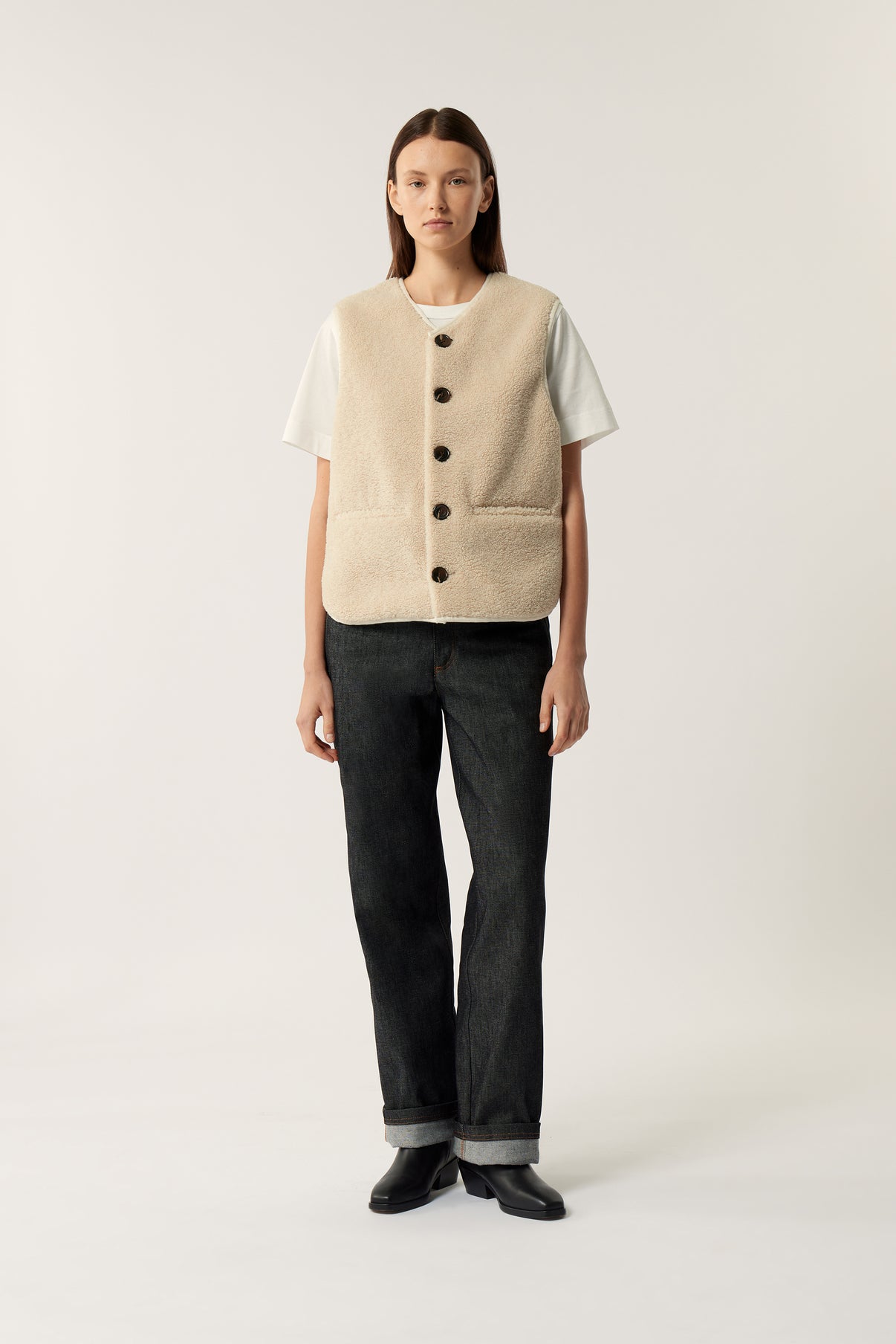 FUSIL is a must-have in the Soeur wardrobe. Designed like a waistcoat to style endlessly, it features a minimalist drape, warm material, and is cut with two front pockets that add a practical element. FUSIL can be slipped under a coat or layered over a simple T-shirt.