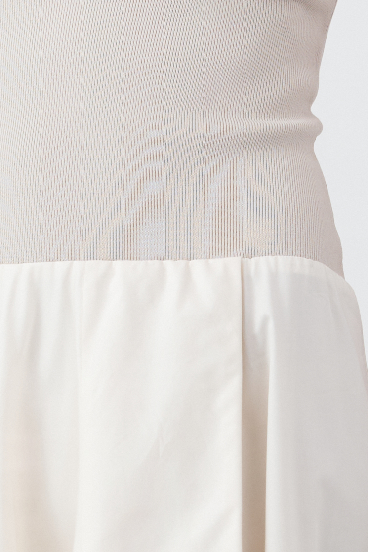 The Knit Bodice Asymm Dress features a classic crew neckline and a fitted knit bodice. Flowing effortlessly into a relaxed, maxi-length cotton poplin skirt with an asymmetric hemline, the Knit Bodice Asymm Dress is a perfect blend of structured comfort and ease.