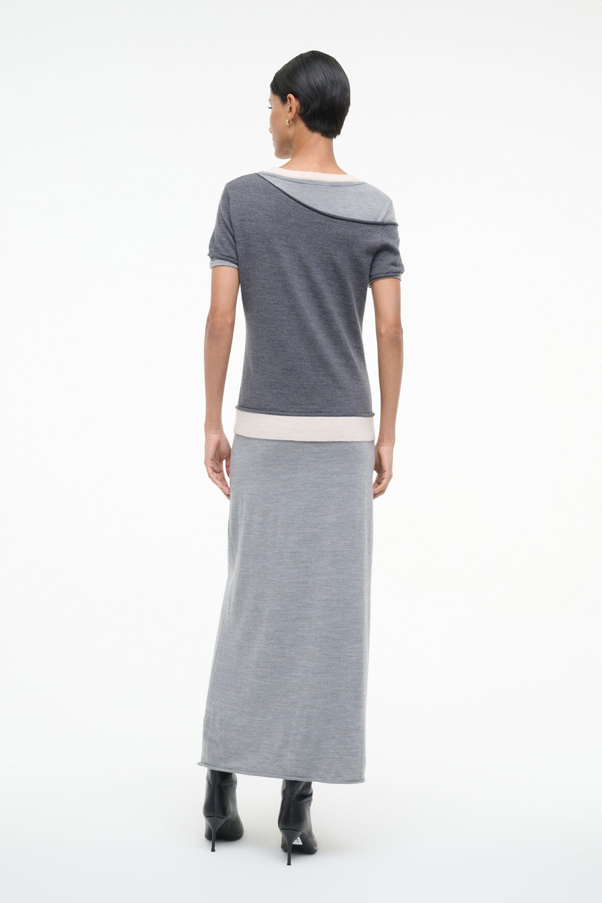 A mixed media merino wool and recycled nylon dress, the Lyric offers a pre-styled layered effect with asymmetric details