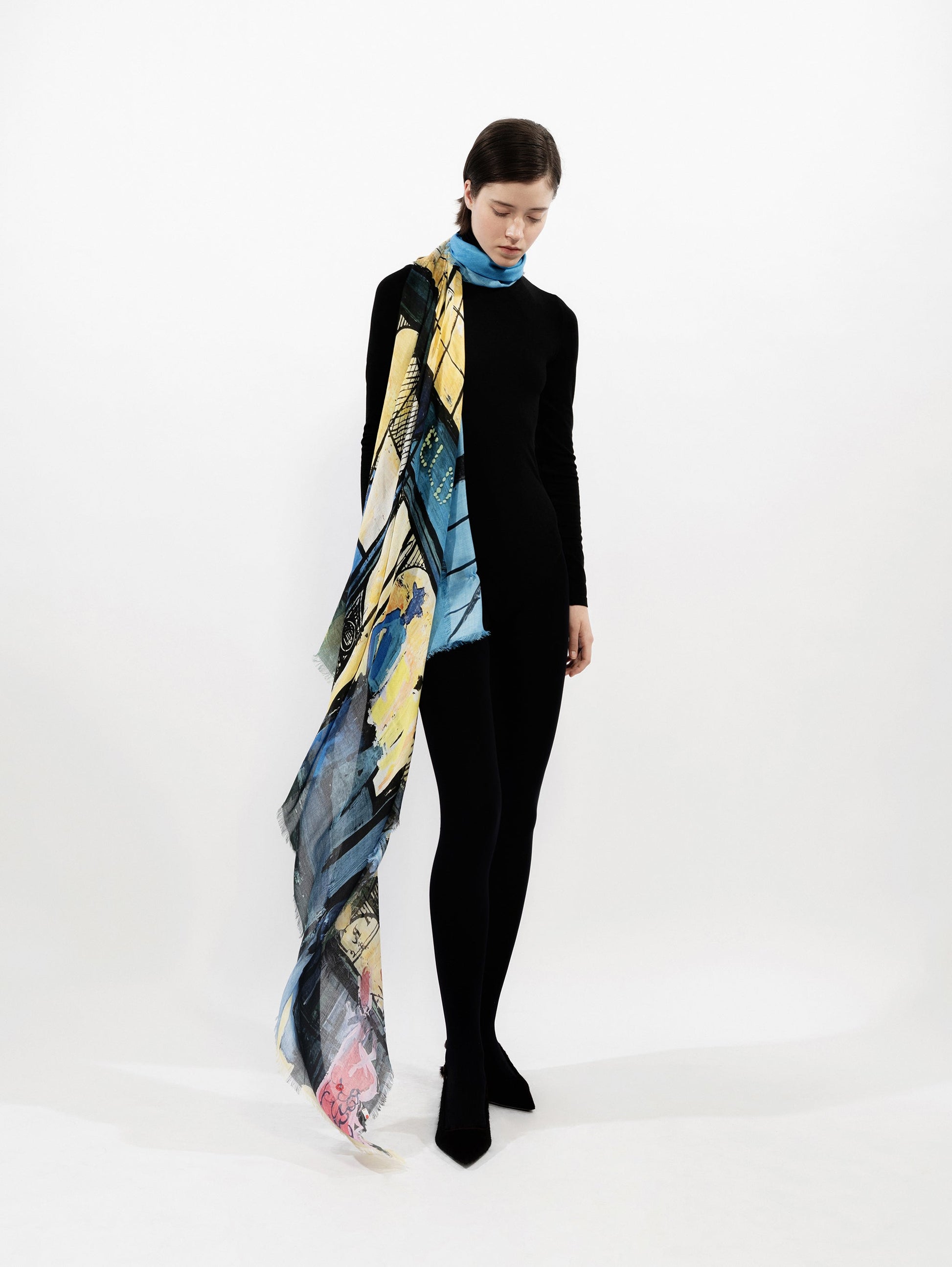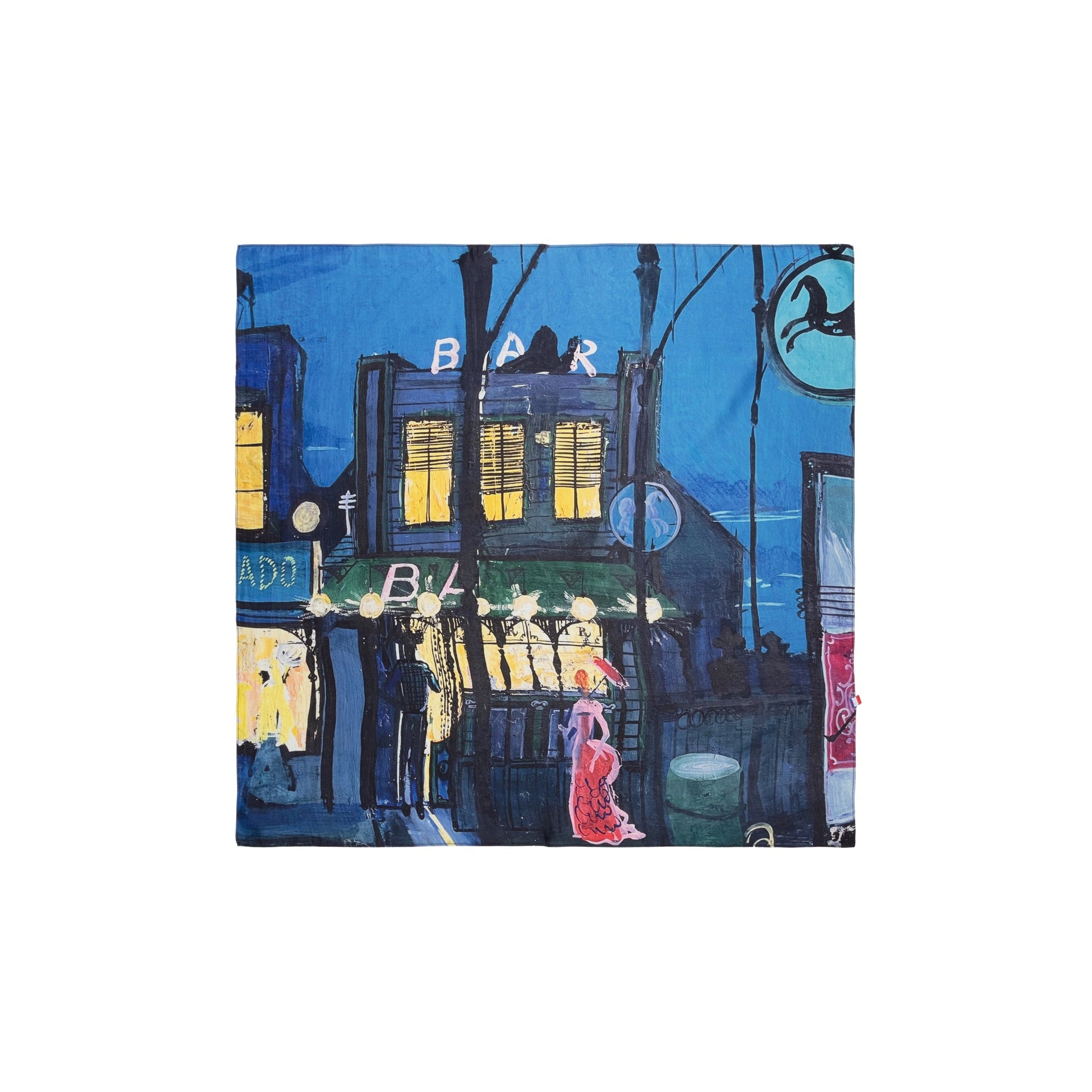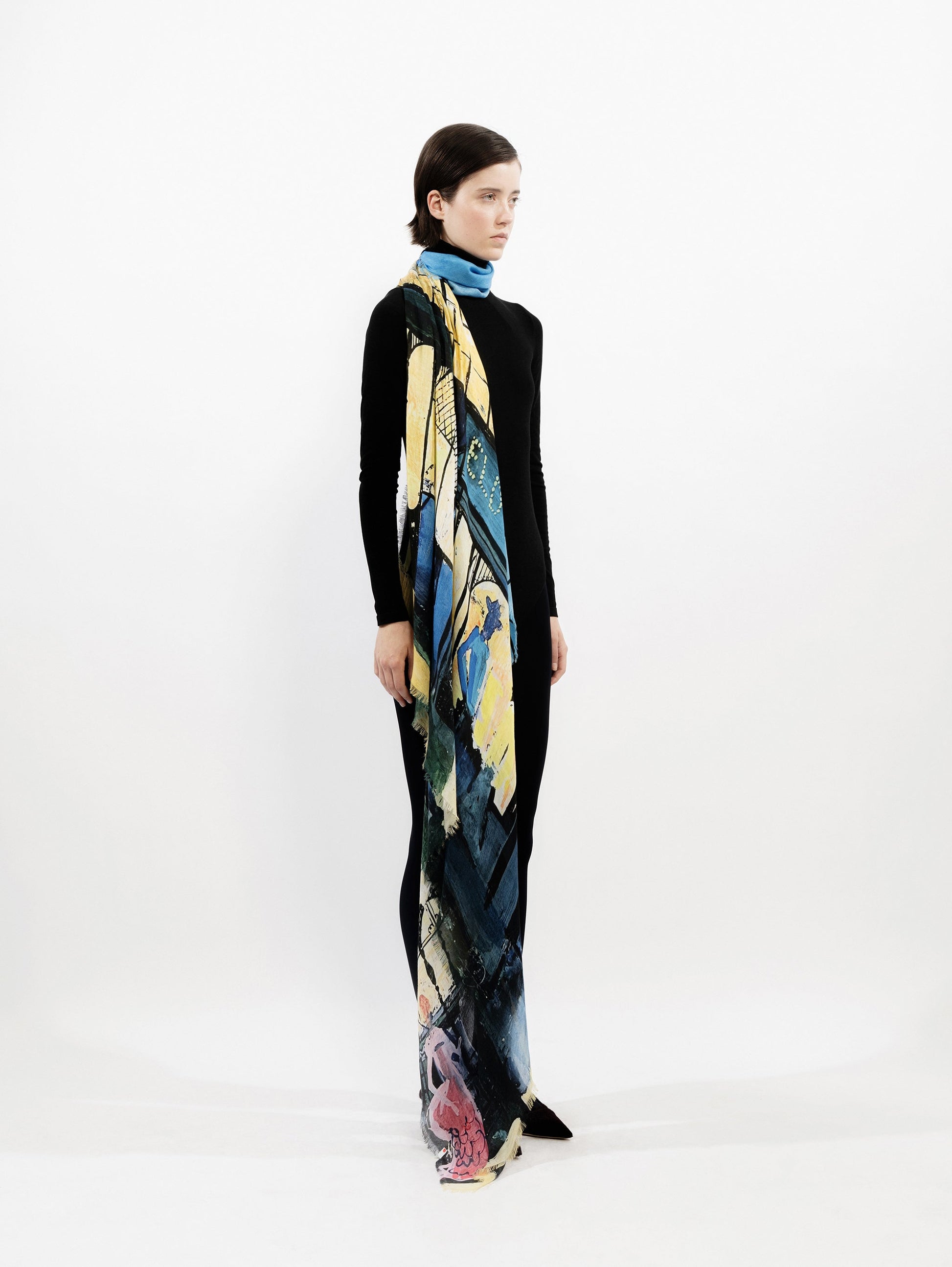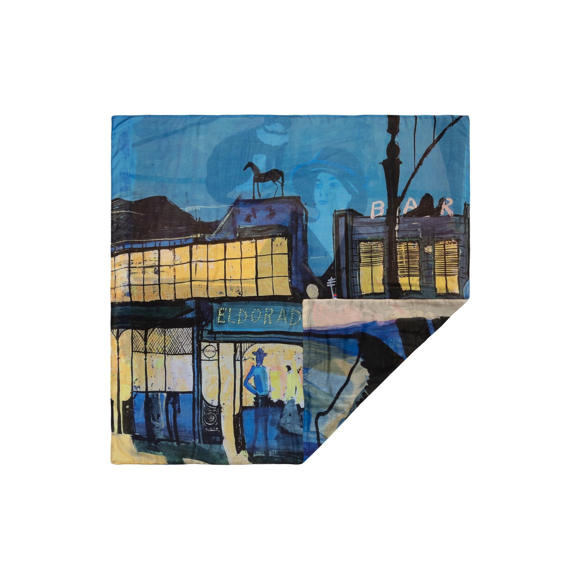 Single face, square shaped scarf, made of a soft, fluid silk/modal fabric with an all-over, high-resolution printed, authentic visual.