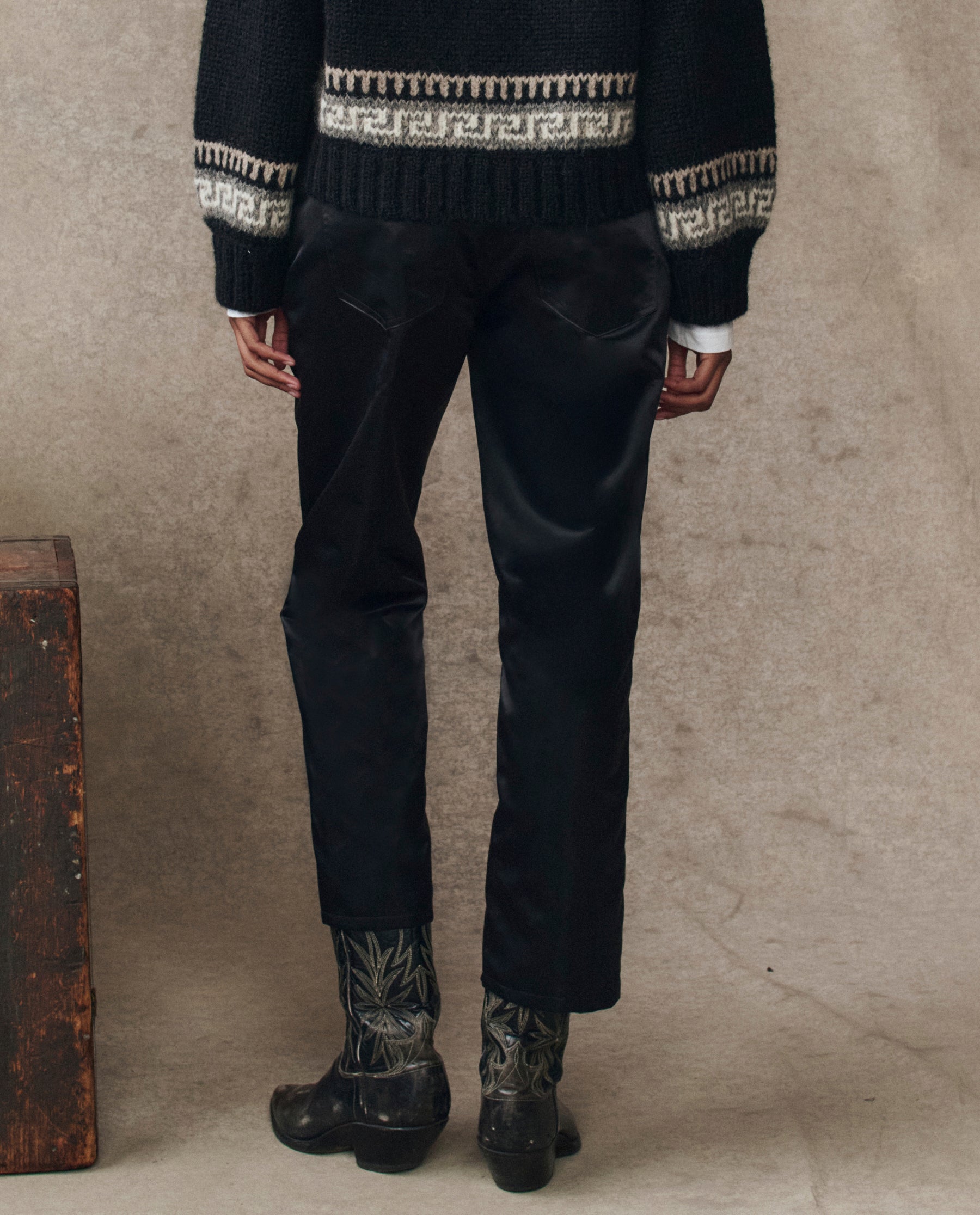 Our cherished slouchy fit returns, dressed up for the holidays in dressier, shiny satin. Named for Emilys late father, this five pocket favorite embodies ease and heritage with its relaxed leg and perfectly cropped length. Wear it 1 to size at the natural waist, or size up to wear it low and borrowed, a nostalgic c