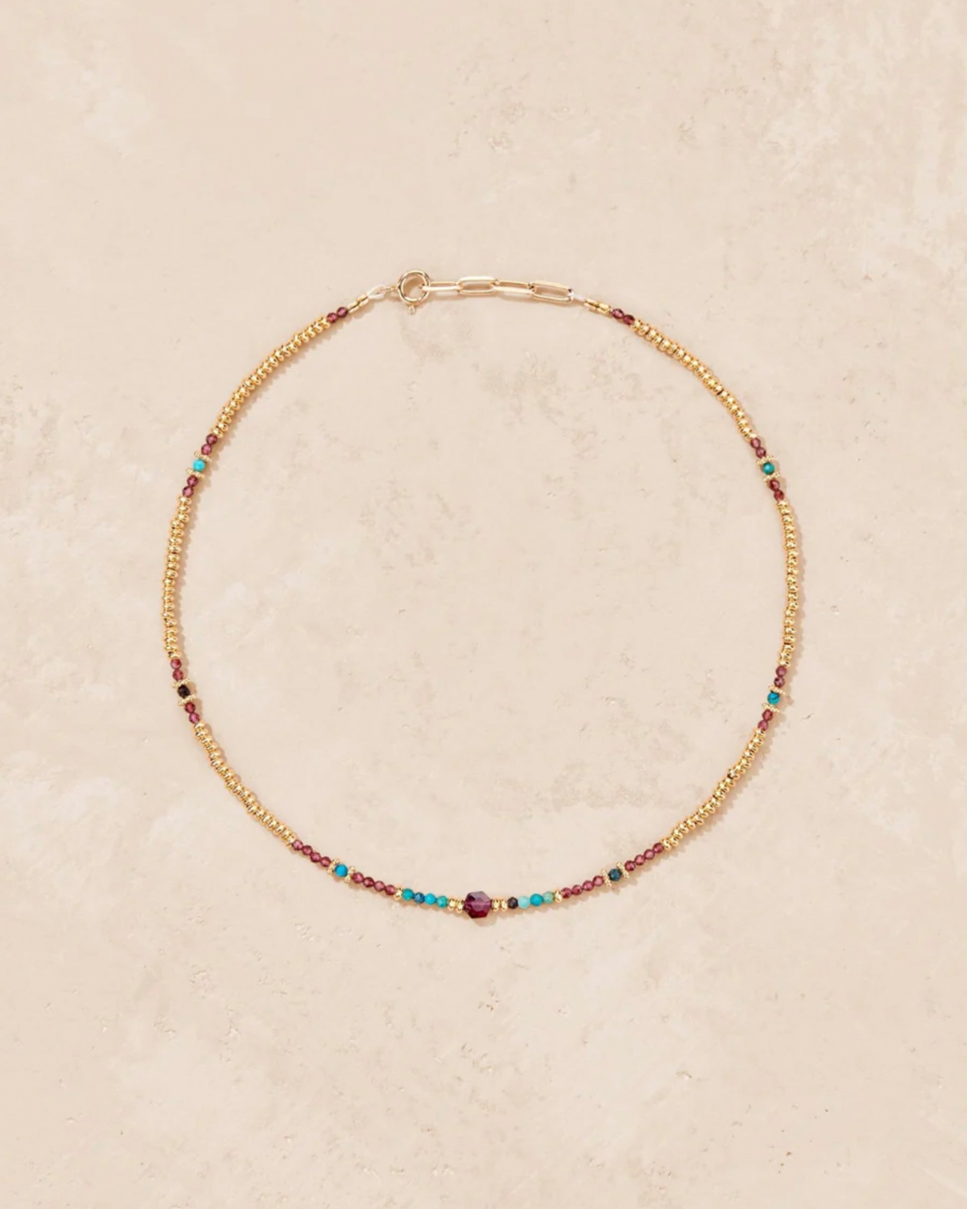 Versatile and spectacular depending on its associations, the Meghna necklace is resolutely chic. It can be both subtle and visual thanks to the choice of fine stones that compose it. Garnet, a stone of passion that captures the light in a unique way and chrysocolla, subtly matte, which gives it a discreet but sophisticated look . Color associations that will punctuate your daily life. This jewel was imagined as an accumulation of unique pieces creating infinite combinations. A signature of the brand.