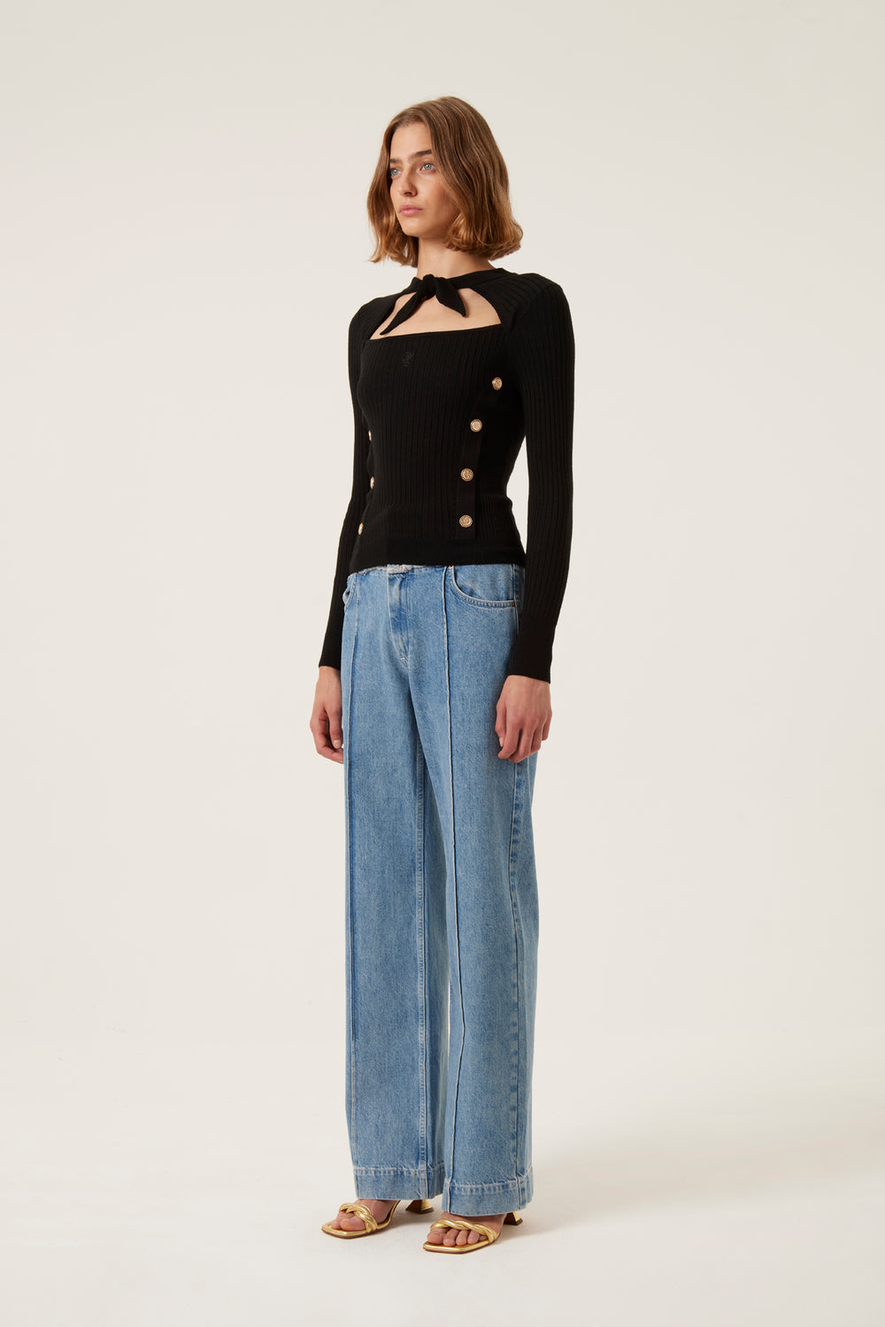 Tie-neck sweaterKnitted sweaterOpening to tie above the chestHalf-moon cutoutSun press stud detail on the front"TRS" embroidery on the front