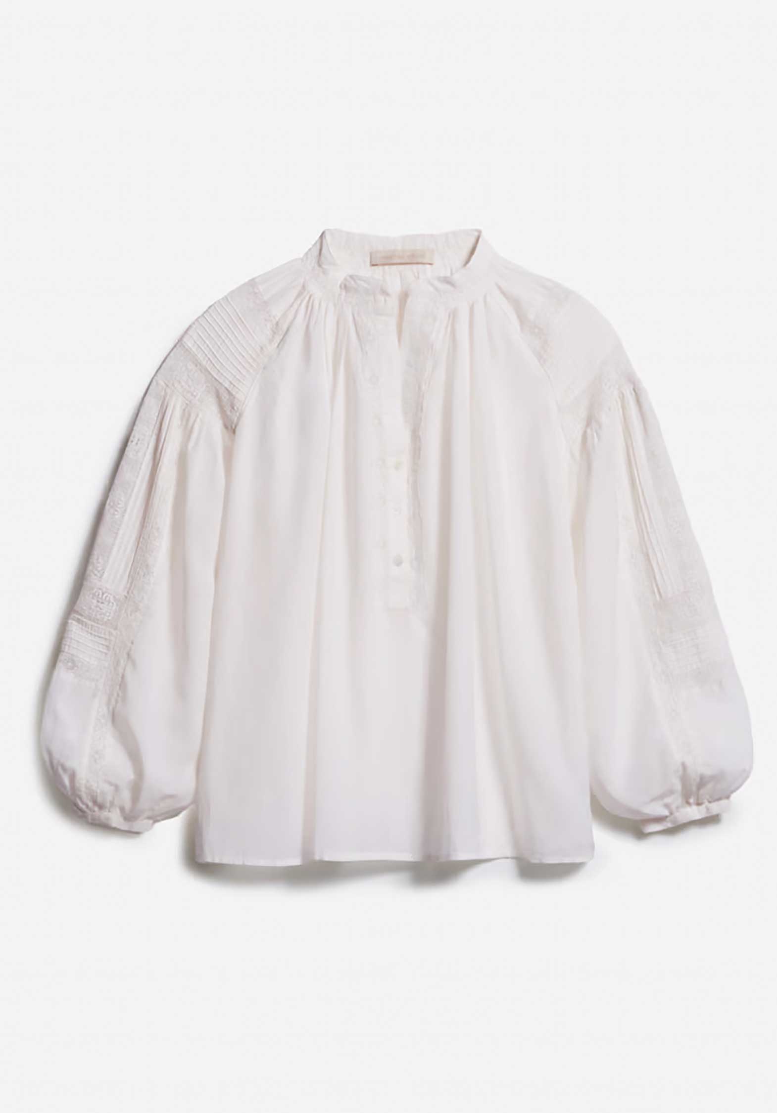 The house's signature blouse. Its airy cut in light, subtly sheer cotton makes Nipoa the ultimate romantic blouse. Its silhouette is defined by dropped shoulders and gathered details at the sleeves. This season, it comes with pleated details and inlaid lace on the sleeves and on the front of the button opening. Wear with jeans or a skirt.