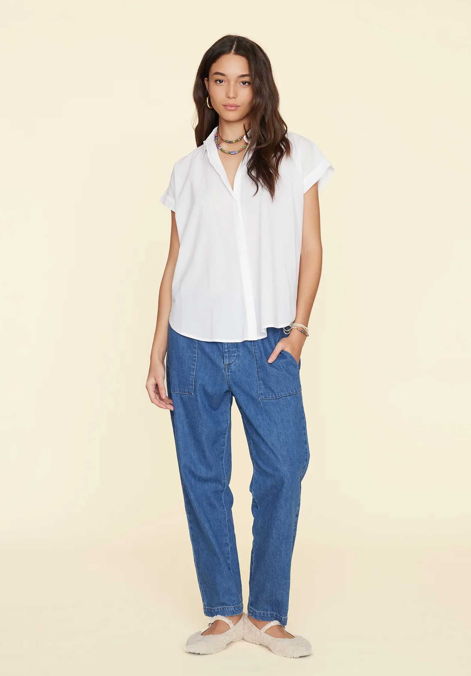 Forever Denim. Mercer is back this season in our mid-weight recycled blend denim. Mercer has a button fly, slight drop crotch, front patch pockets, back pockets with button closures, and an elastic back.