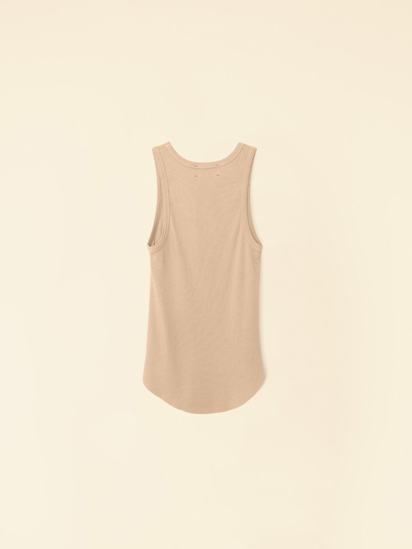 Back to Basics. Arynn is made in our stretch cotton rib knit. This soft cut away tank has a raw shirttail hem and is a staple layering piece.